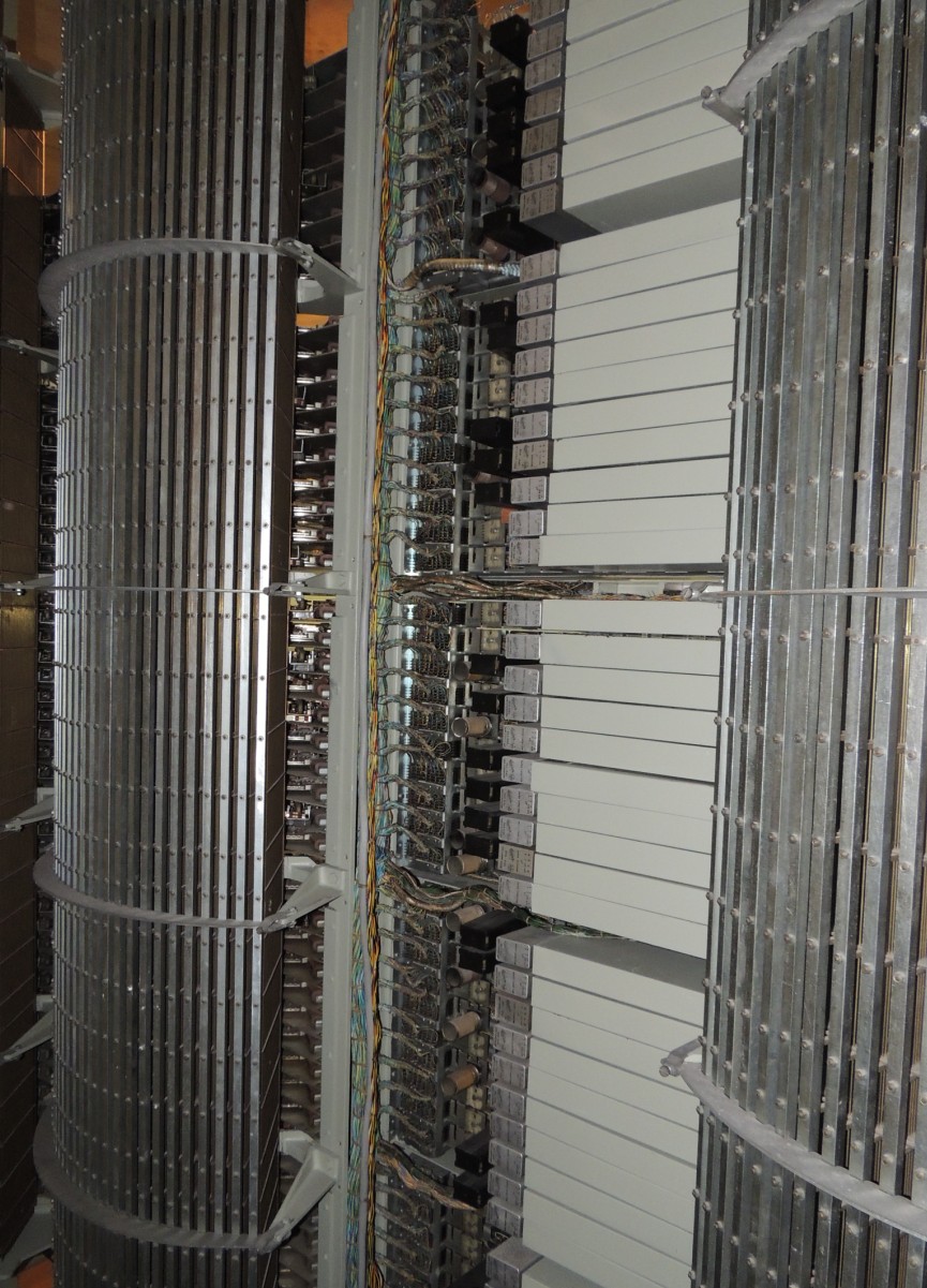 De izquierda a derecha hay tres bastidores con buscadores y selectores del sistema rotatorio AGF de Ericsson (que provienen de la central original de San Sebastián San Marcial instalada en 1926). Luego hay un bastidor con relés de abonado del sistema AGF y a la derecha hay otro bastidor con elementos de tecnologías de barras cruzadas, provenientes de una central del sistema ARF de Ericsson.