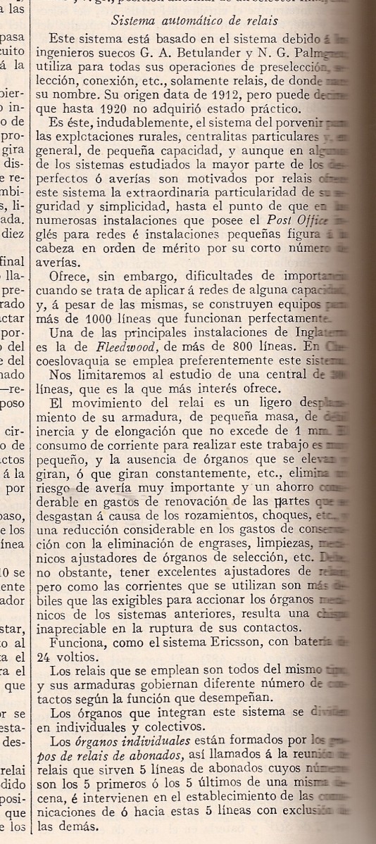 • Centrales manuales de conmutación, donde se incluye el esquema básico de una comunicación con el detalle de todos los elementos que intervienen. Es especialmente interesante la explicación de los relés (que entonces se denominaban relais). Se explican las centrales de batería local y central, con los diferentes tipos, así como los cuadros conmutadores simples y múltiples