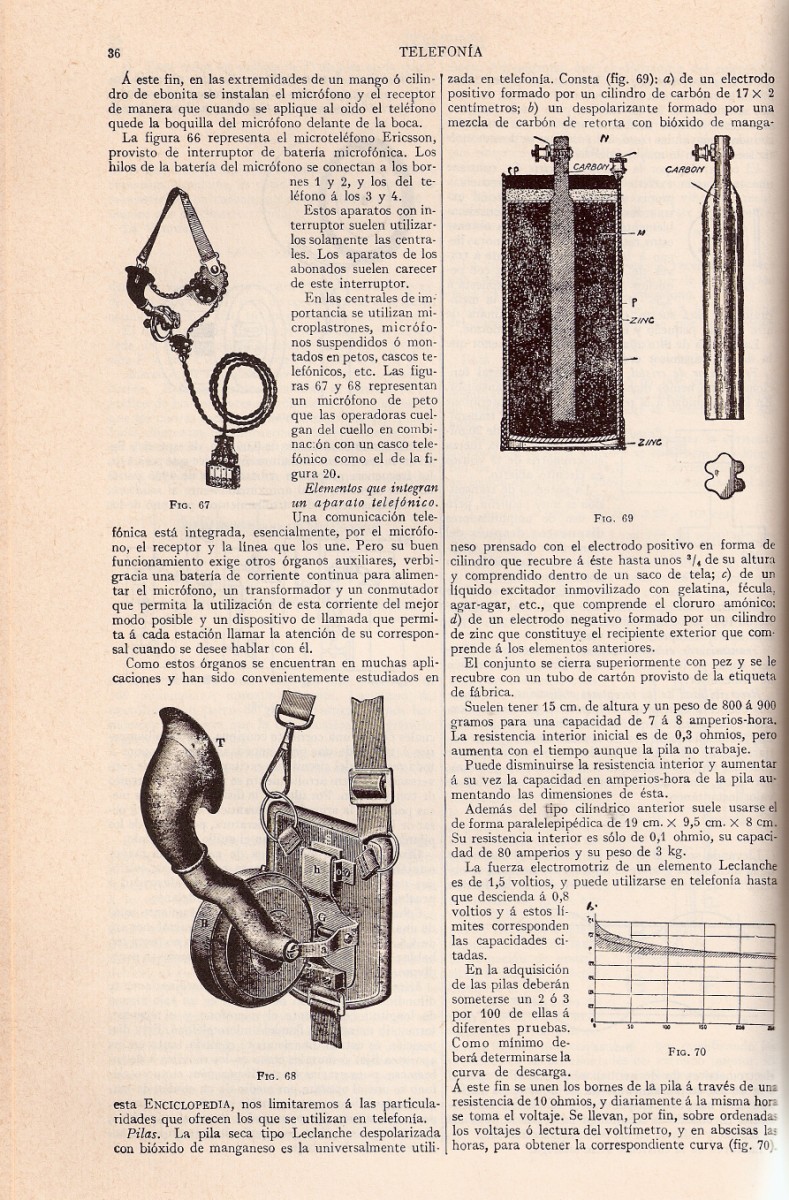 En el volumen 60 aparecen las entradas telefonía, desde la página 5 a la página 266; telefonía sin hilos (pág 266 a 305) y teléfono (pág 305 a 321). Ciertamente, este conjunto de entradas supone un manual de referencia completísimo de la telefonía de la época, con una cantidad de información técnica sorprendente para una enciclopedia.