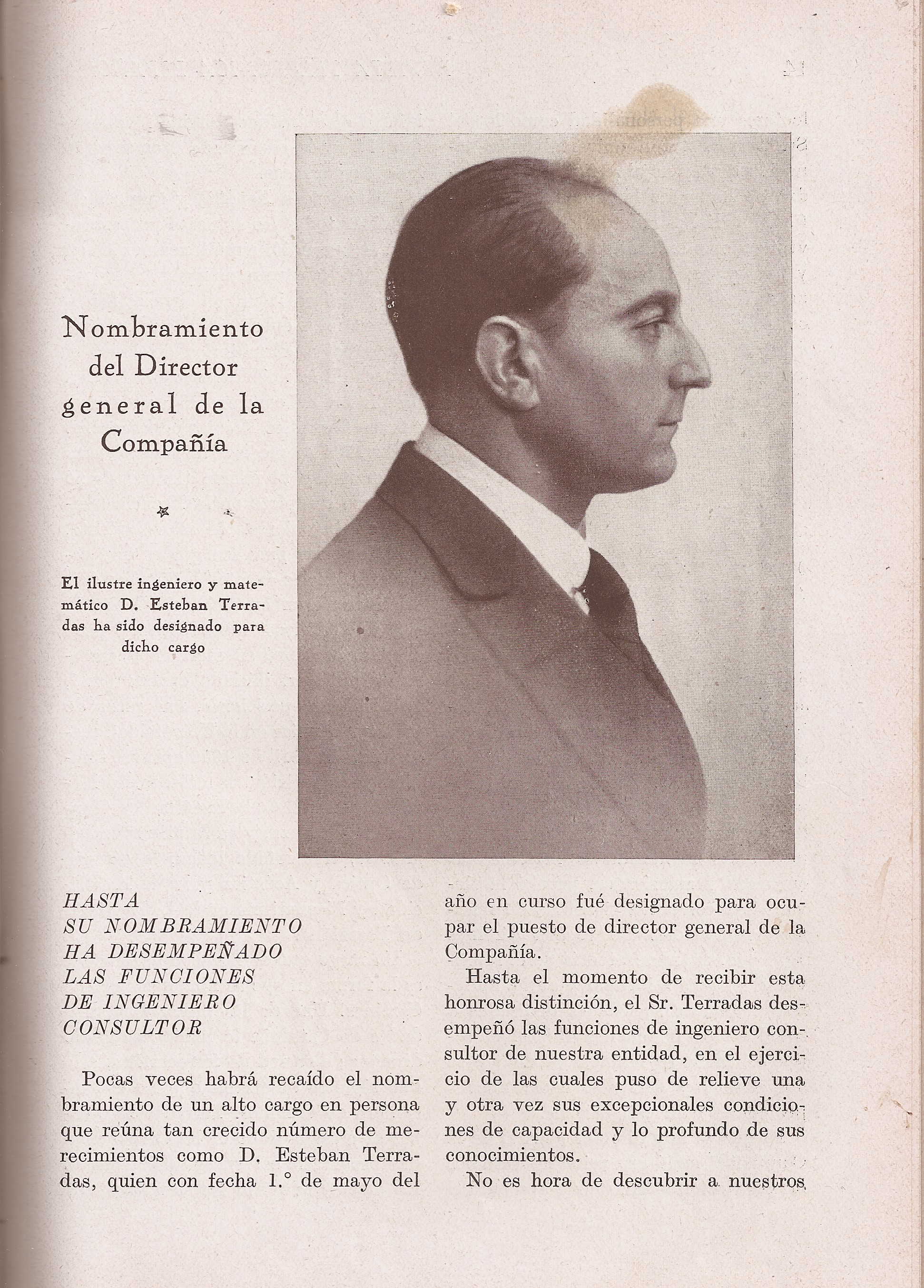 En 1924 Terradas renunció a su puesto en la Mancomunitat al entrar en la ITT, la empresa americana que creó la CTNE para hacerse con el monopolio del servicio telefónico en España a través del contrato con el Estado. Posteriormente pasa ya a pertenecer a la CTNE, como Director de Instrucción y en 1926 es nombrado Director general. Aquí os dejamos copia de la noticia que ofreció la Revista Telefónica Española. (Revista Telefonica Española, dic 1929)