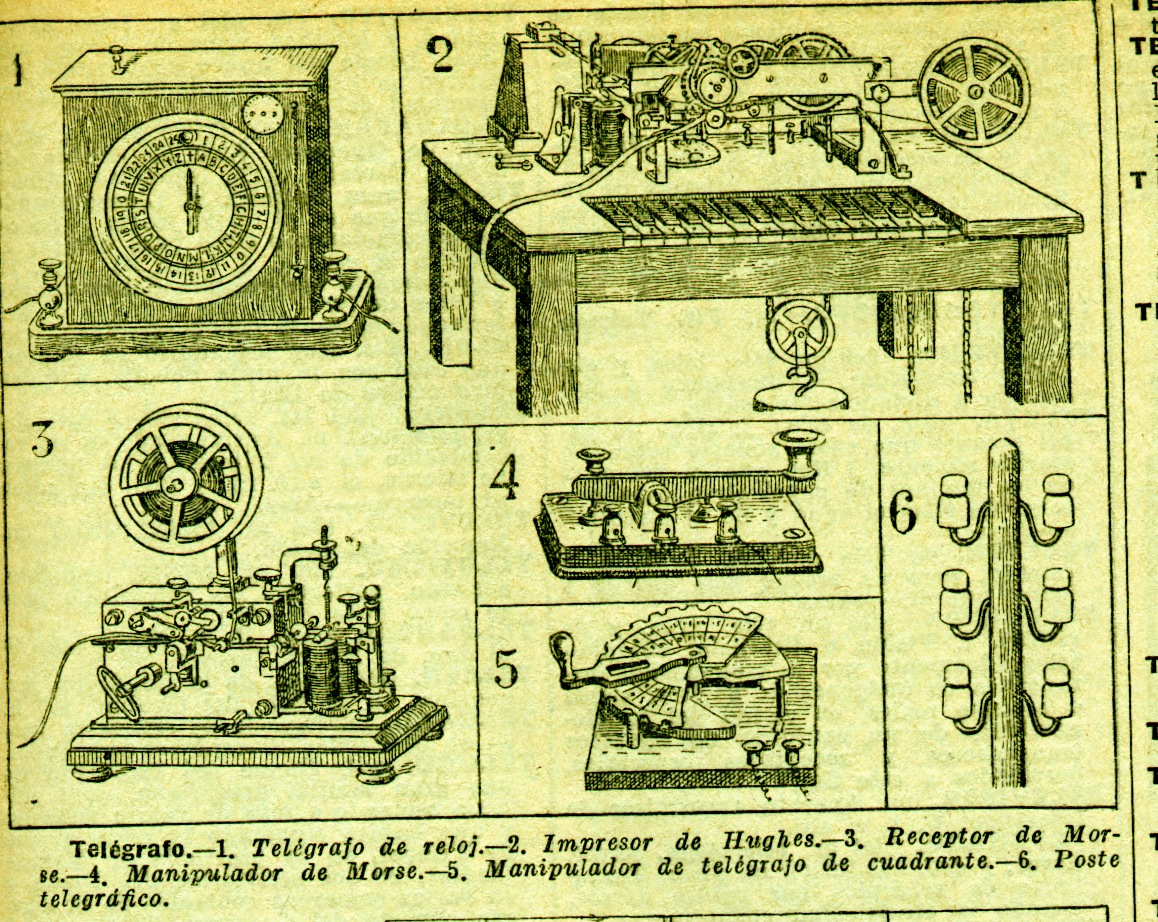 Copia integra de las dos páginas del diccionario (páginas 1052 y 1053 del Tomo II) que incluyen los términos entre TELA y TELERON, con los dibujos anteriores y una tabla del código MORSE, la podéis ver aquí.