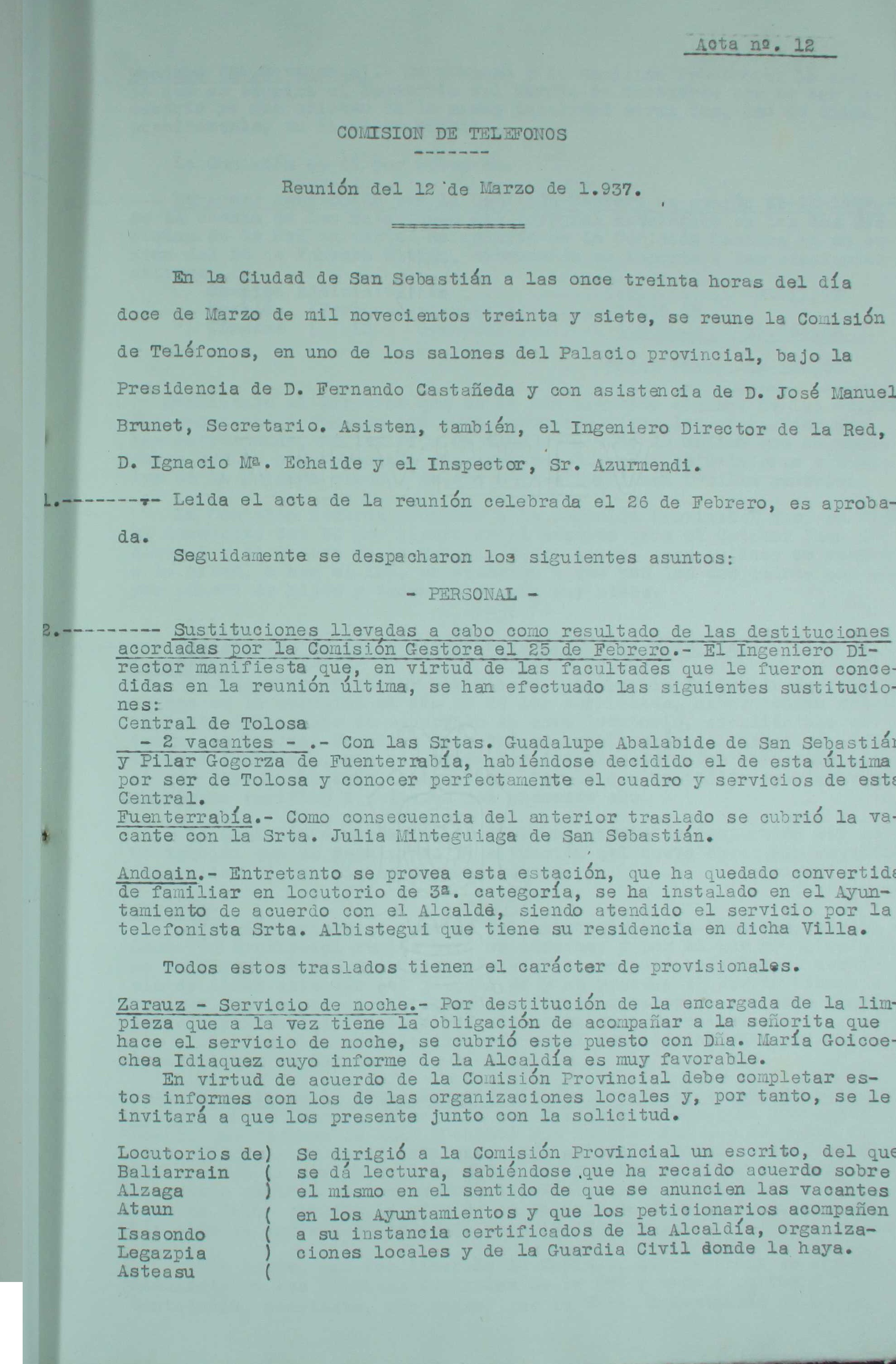 - Acta nº12 de la Comisión de Teléfonos de Guipúzcoa de 12 de marzo de 1937. Aquí se incluye la relación de bajas de personal por destituciones y personal sancionado. También queda patente la escasez de personal, por lo que se tuvo que suspender el servicio en determinadas zonas, así como las condiciones deplorables en que estaba el “personal masculino en la Red” que era el “Personal de Lineas”.