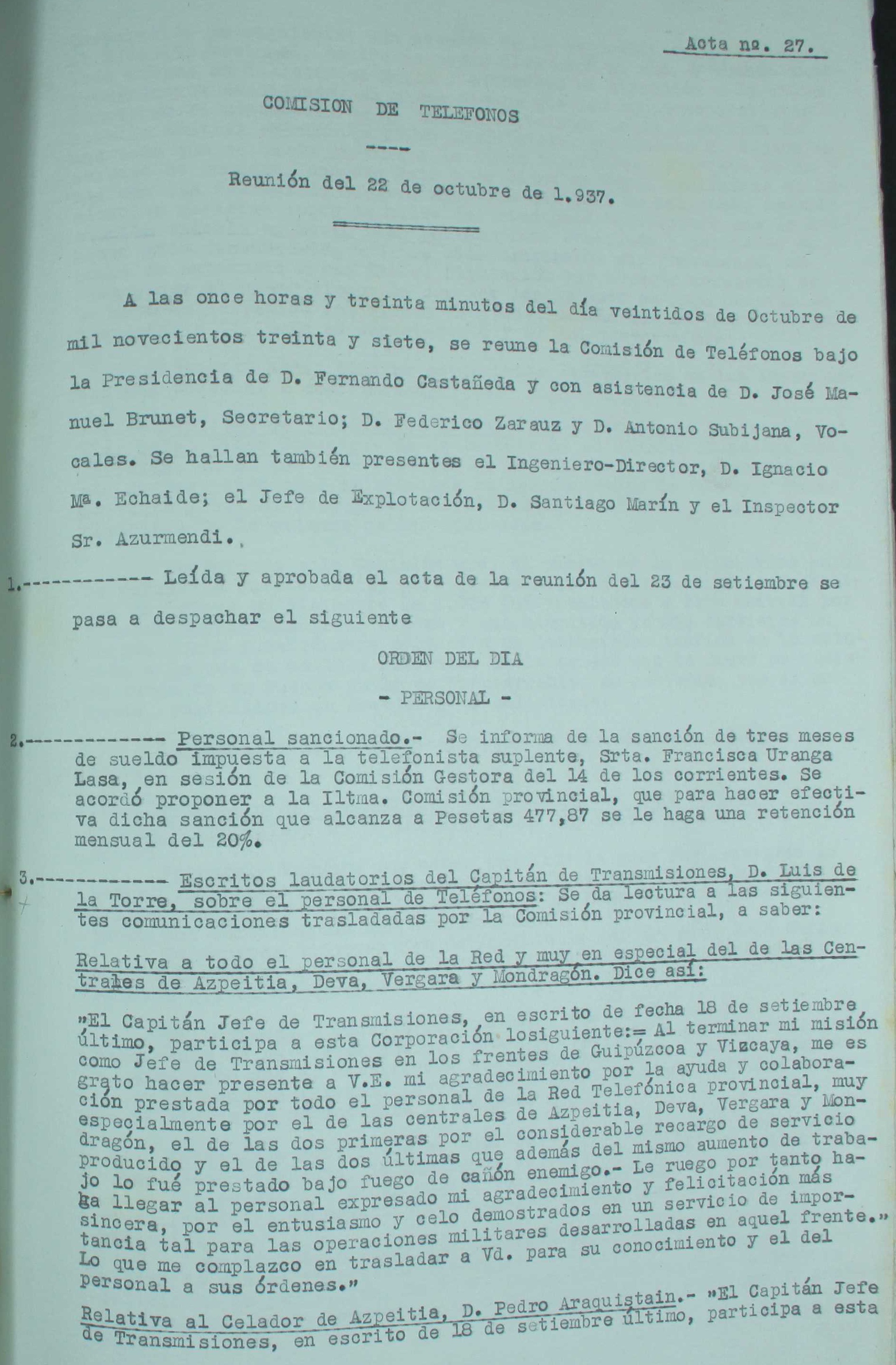 - Acta nº 27_de la Comisión de Teléfonos de Guipuzcoa de 22 de octubre de 1937 (AGG_JDIT_1113_3) .En este acta aparece un documento interesante, como es una carta laudatoria del Capitán de Transmisiones (Jefe de Transmisiones en los frentes de Guipúzcoa y Vizcaya) agradeciendo la ayuda prestada por todo el personal de la Red Telefónica Provincial, en especial a un celador de Azpeitia que, haciendo uso de un aparato de campaña, facilitó las comunicaciones telefónicas del ejercito nacionalista cuando él estaba en zona republicana.