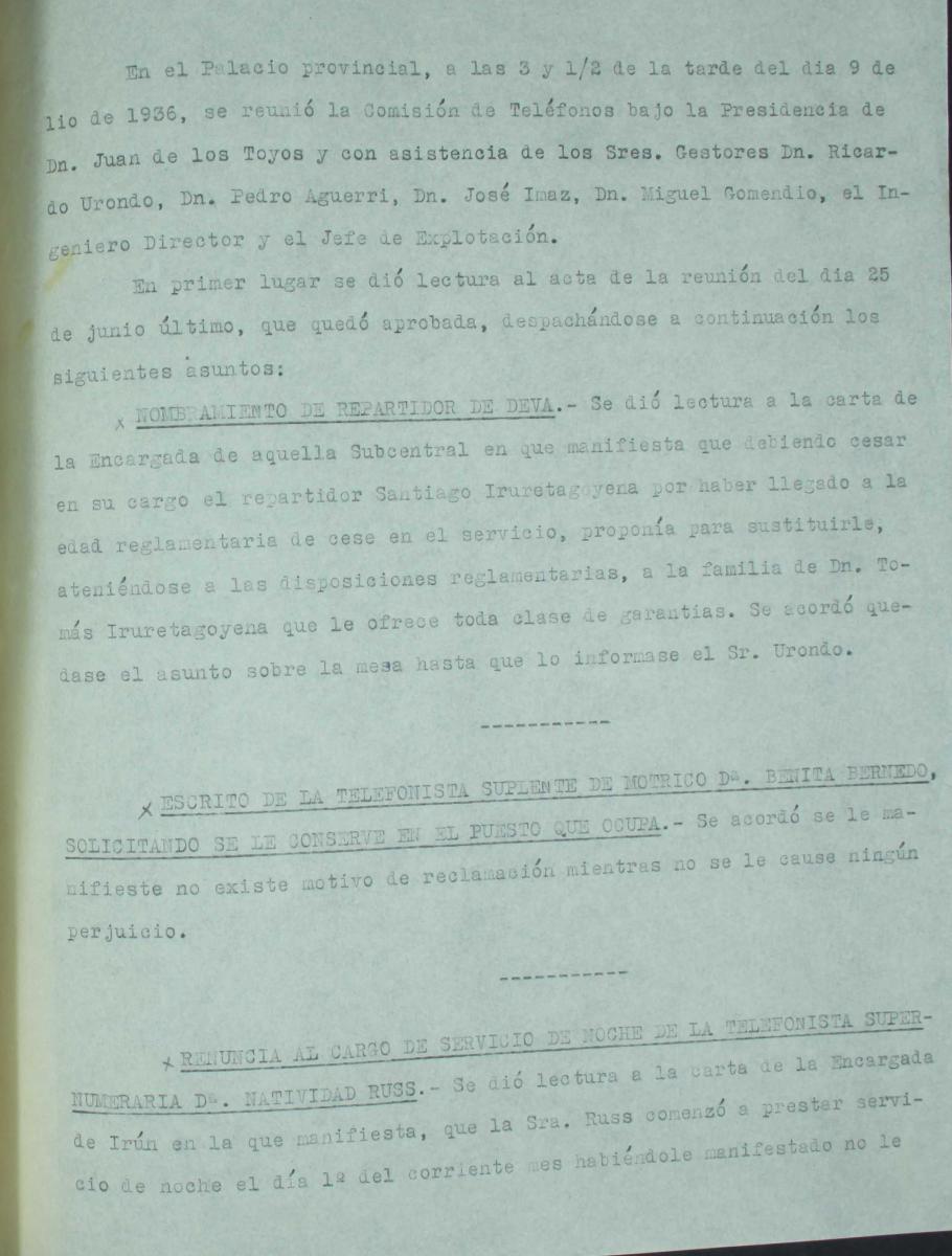 - En el Acta de la Comisión de Telefonos de Guipúzcoa de 9 de Julio de 1936 , se pueden comprobar los asuntos normales que se trataban en la Comisión de Teléfonos de la Diputación: temas de personal, concursos de materiales, gestión de los centros familiares, etc.