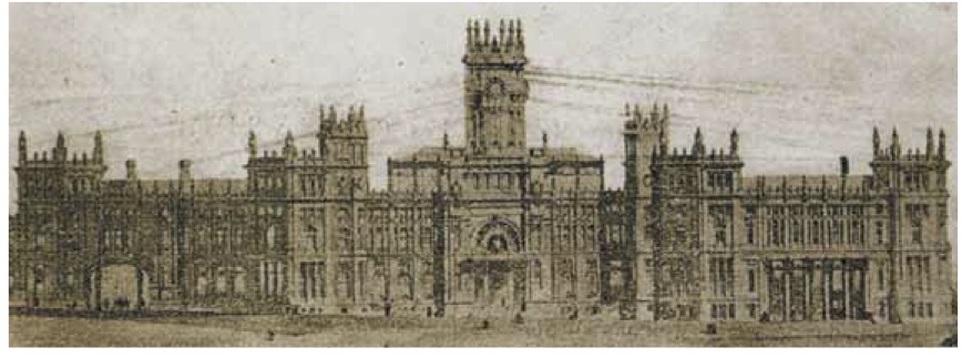 Palacio de Comunicaciones Madrid. Palacios y Otamendi. Proyecto 1904 donde se dibujan los previstos cables aéreos desde la torre del reloj. Imagen ver Nota.