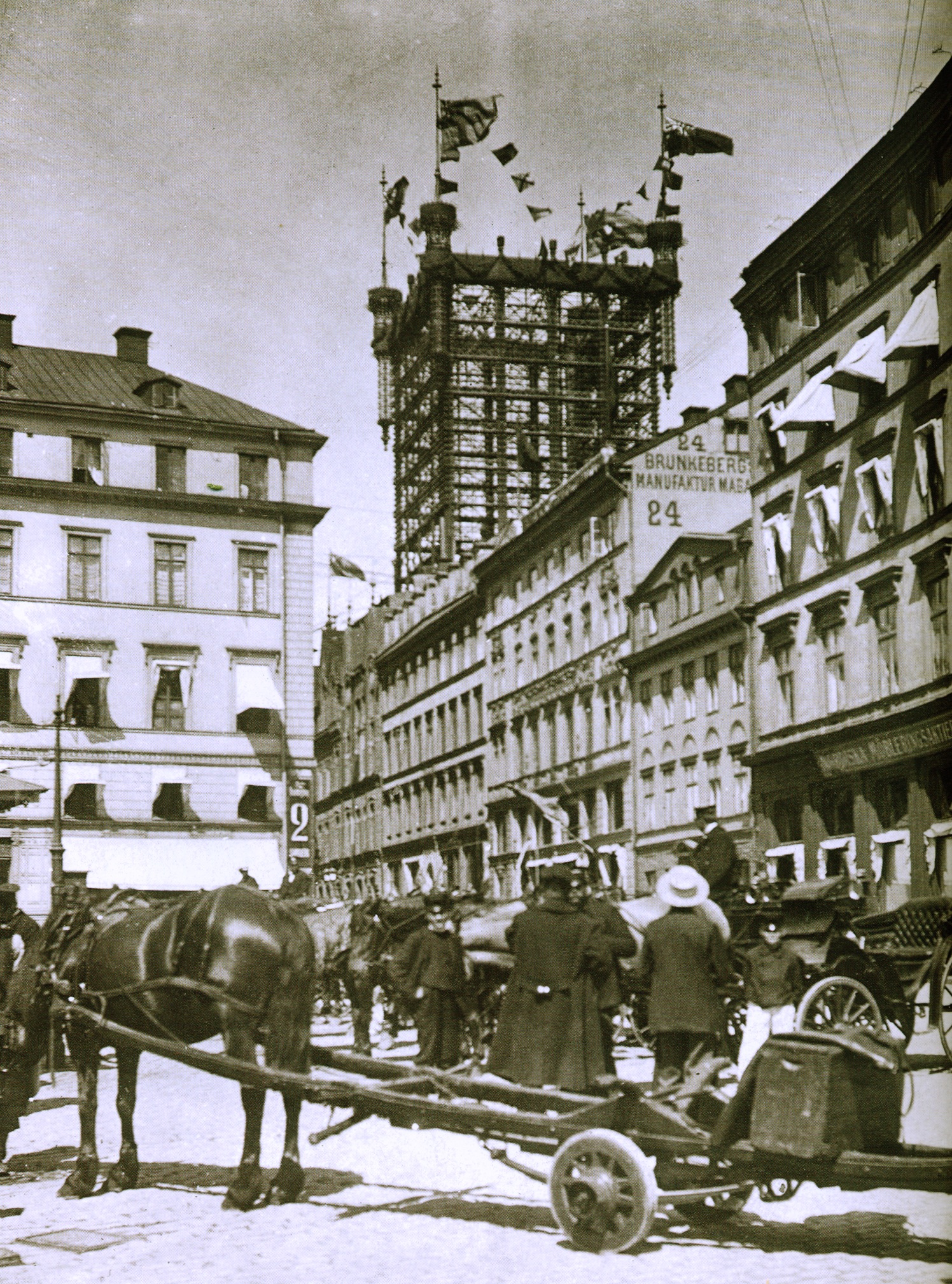 Torre de Teléfonos desde la Plaza de Brunkerbergstorg entorno a 1915 en Estocolmo ya fuera de servicio. Foto archivo histórico de Ericsson.