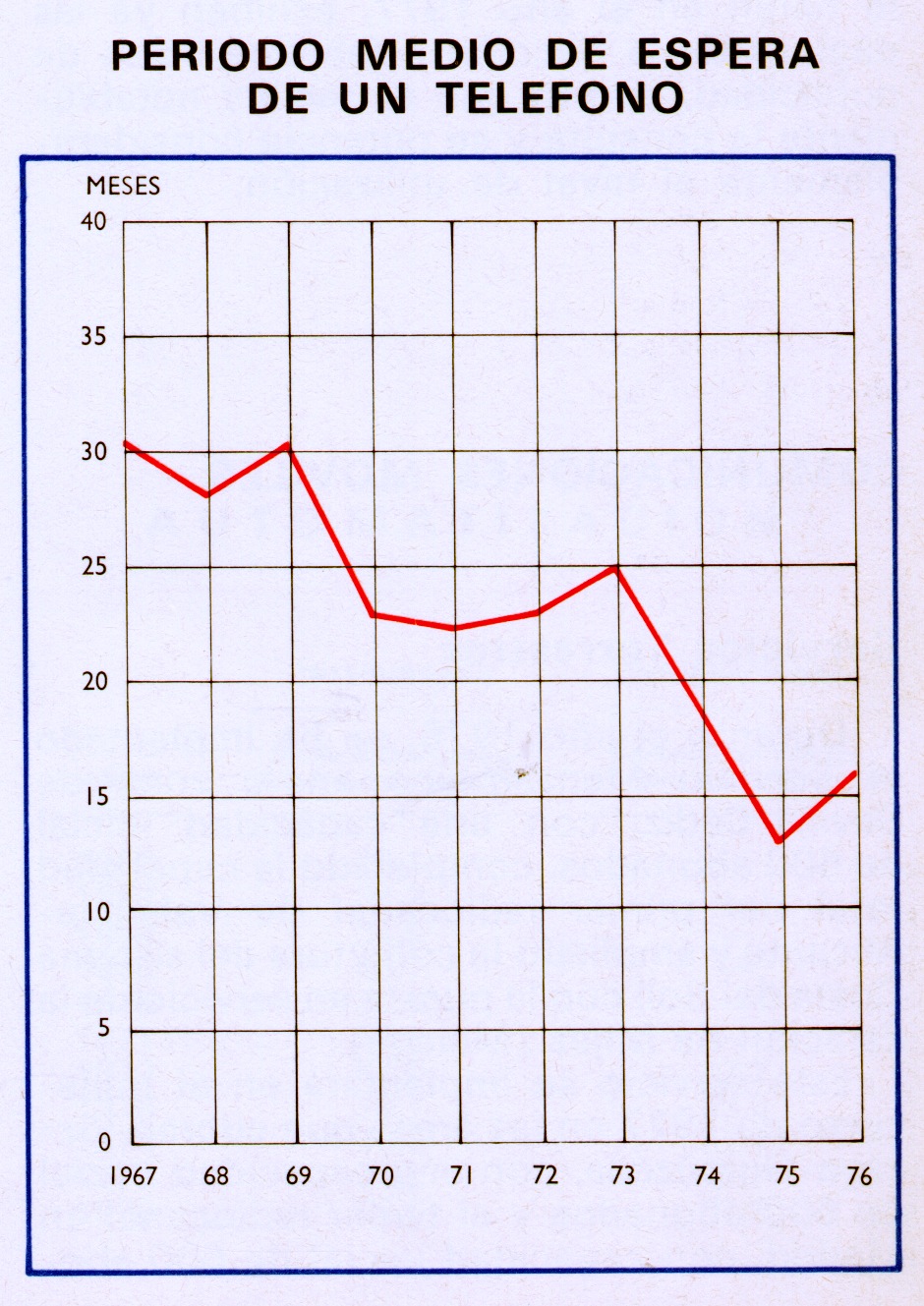 Una lista de espera de «dos años» para conseguir que la CTNE te pusiera un teléfono en aquella España que apenas salía de la autarquía. Parece mucho, pero claramente la medida no funcionó, pues según los datos que podemos consultar en los Informes anuales de la compañía, todavía diez años después, el periodo medio de espera rondaba los dos años y medio.