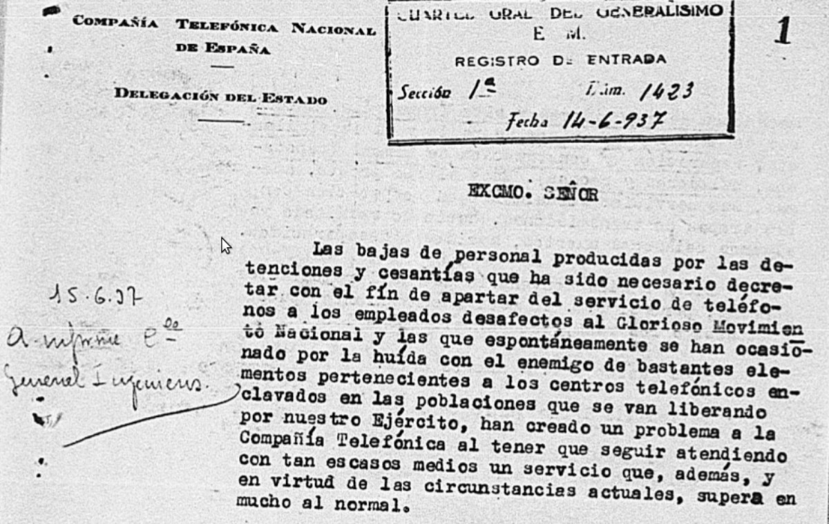 Gobierno de España. Ministerio de Defensa. Archivo General Militar de Ávila. Carta de la CTNE a la Secretaría General del Gobierno de Burgos. Signatura C2326_50_67 (año 1937)