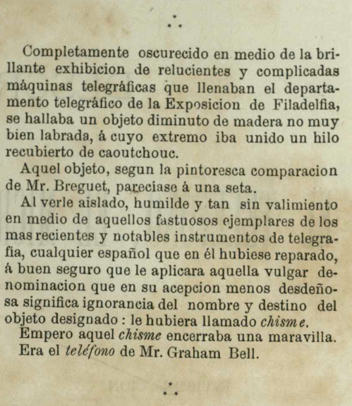 En su introducción, comenta la celebración de la «Exposición Universal de Filadelfia» de 1876, en la que se presentó el teléfono por Graham Bell y su impacto entre los ilustres visitantes del evento, en un momento en el que el telégrafo alcanzaba ya un muy alto nivel de perfección.