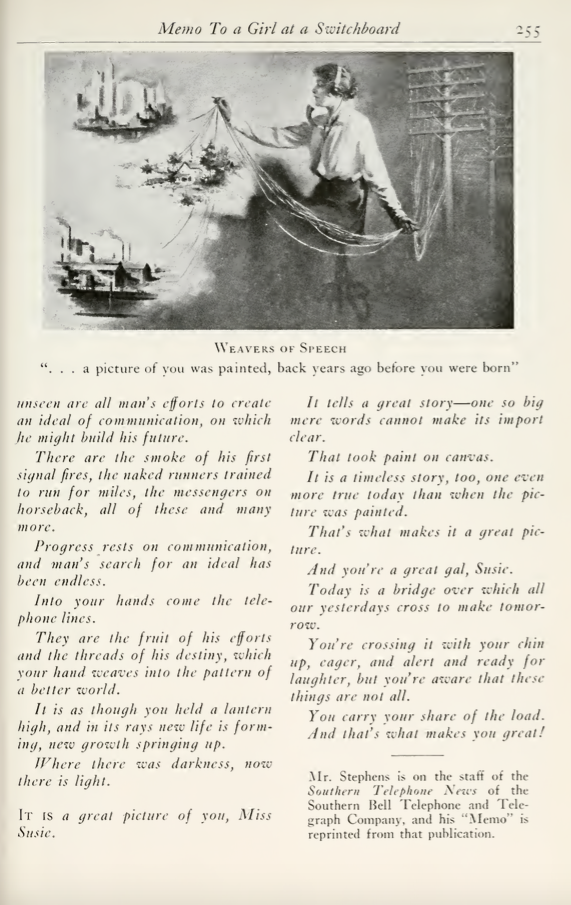 La campaña que da título a esta entrada «Weavers of Speech», apareció por primera vez en el número de diciembre de 1915 en la revista de la propia Bell System. Se apoya en una pintura originalmente realizada al oleo en blanco y negro por el pintor e ilustrador americano Thornton D. Skidmore (1884-1956) con el mismo título (al parecer inicialmente se empleó el de «Spinners of Speech», -hilanderas- cambiándose por el «tejedoras», venció el tápiz frente al hílo).