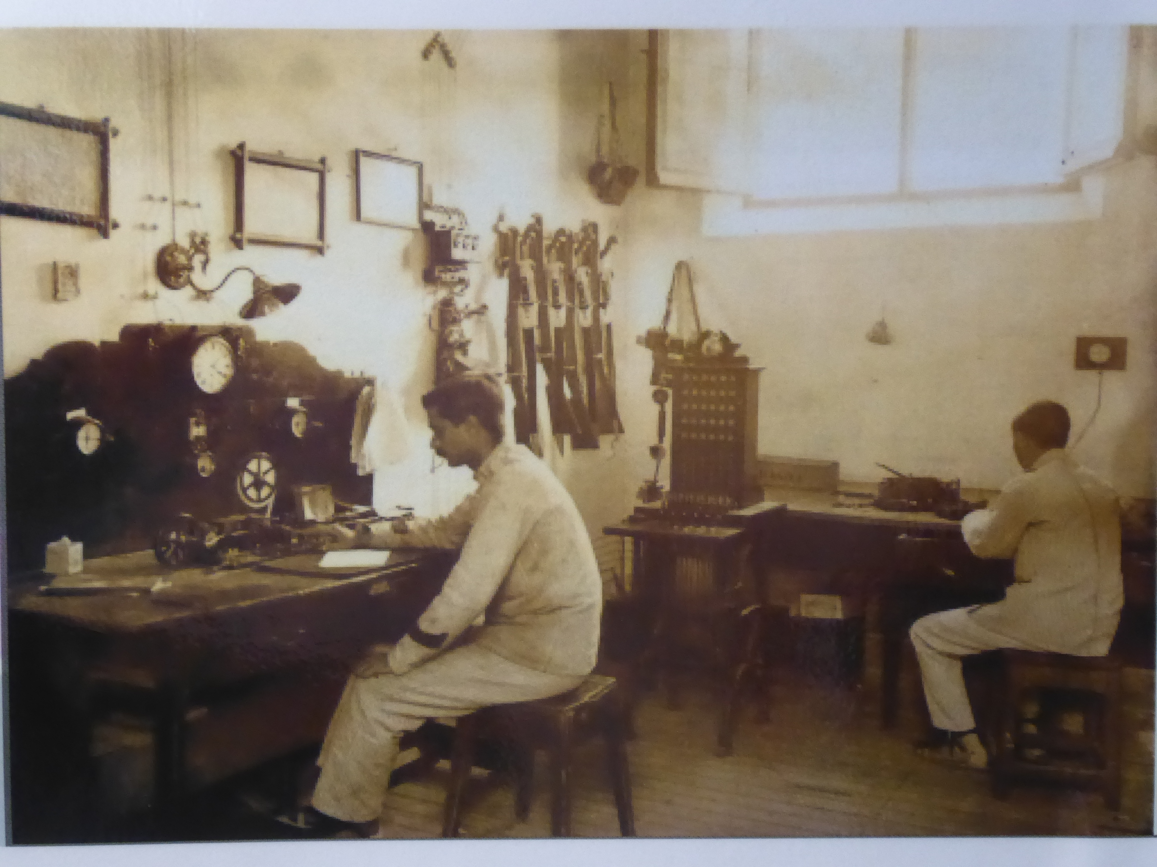 Antigua foto taller de reparación equipos de transmisiones. Finales siglo XIX-principio del XX