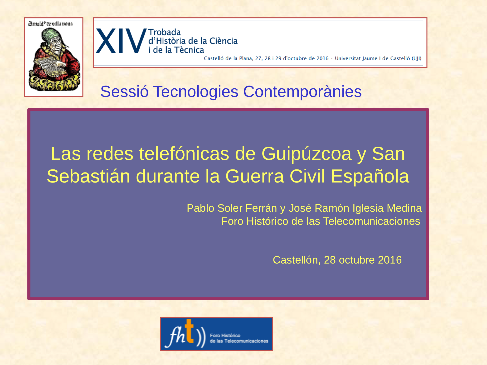 La comunicación de Pablo Soler y José Ramón Iglesia, realizada por el primero, presentó el estado actual de una investigación en curso (y que se espera culminar con un artículo para enviar a una revista especializada) sobre la gestión de las redes telefónicas de Guipúzcoa y San Sebastián durante la Guerra Civil Española. Se puede ver la presentación aquí. Dicha investigación se basa en una exhaustiva prospección y consulta de fuentes archivísticas, principalmente de la Diputación de Guipuzcoa, del Ayuntamiento de San Sebastián y de Ericsson España que ya se ha completado y sobre las que próximamente se finalizará una primera catalogación, ya muy avanzada.