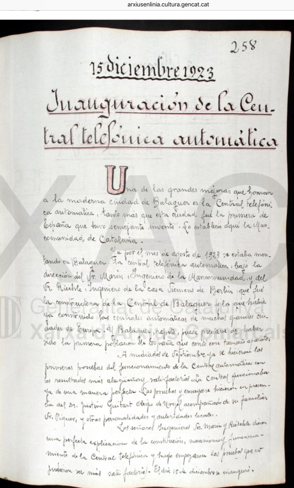 Ya por el mes de Agosto de 1923 se estaba montando en Balaguer la central telefónica automática, bajo la dirección del Sr. Marín, Ingeniero de la Mancomunidad, y del Sr. Riechle, Ingeniero de la Casa Siemens de Berlín, que fue la constructora de la Central de Balaguer y la que había ya construido las centrales automáticas de muchas grandes ciudades de Europa. Y Balaguer, repito, puede preciarse de haber sido la primera población de España que contó con tamaño aparato.