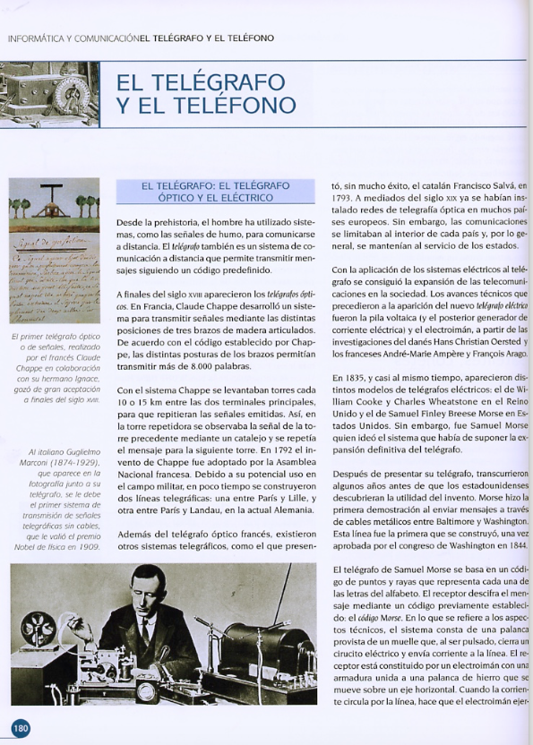 Se trata de una obra de 13 tomos centrada en el temario escolar de secundaria y bachillerato de principios de este siglo XXI en España. En el volumen 7 dedicado a la «Informática y la Comunicación» encontramos un apartado de 6 páginas dedicado al Telégrafo y el Teléfono, que podeis leer completo aquí.