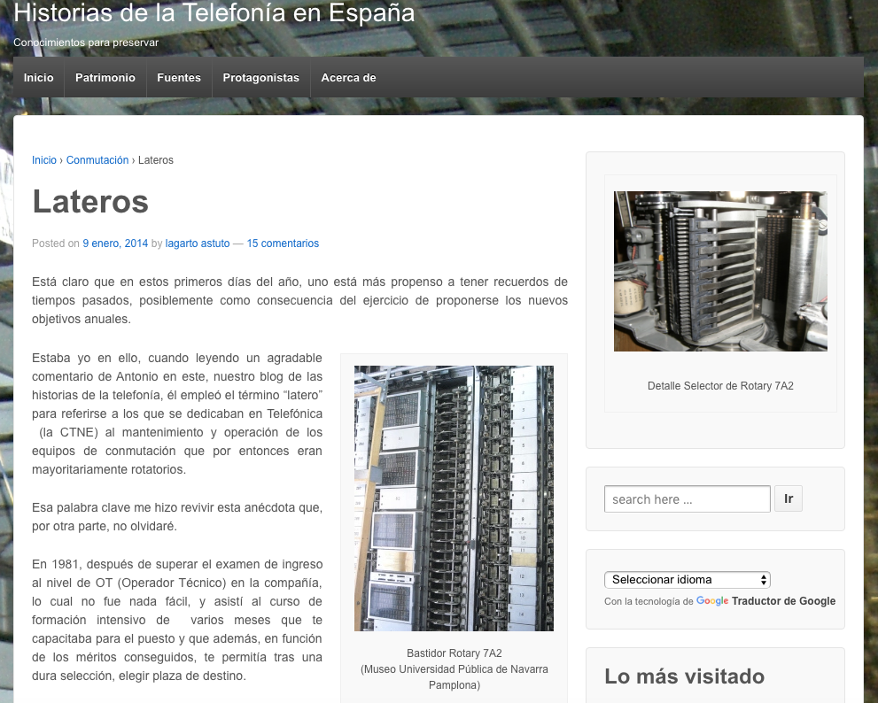 Recordando nuestros inicios «telefónicos» en el mundo de aquéllas fantásticas máquinas electromecánicas de conmutación telefónica, publicamos en enero de 2014 estos recuerdos que, muchos de los que por allí pasaron, seguro comparten. Fue visitada en directo casi mil veces (indirectamente, la contabilización de las visitas se pierde en las estadísticas).