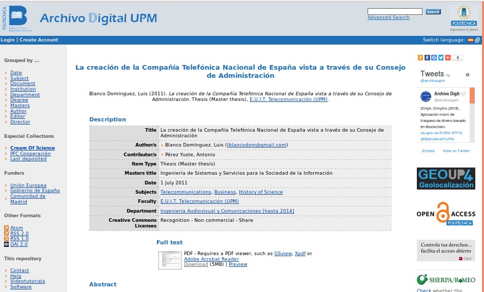 Hace tiempo tuvimos noticia de un Trabajo Fin de Máster extraordinario, el de Luis Blanco Dominguez bajo el título La creación de la Compañía Telefónica Nacional de España vista a través de su Consejo de Administración, que está disponible en el repositorio digital de la Universidad Politécnica de Madrid (lo podéis descargar en el propio enlace del título).