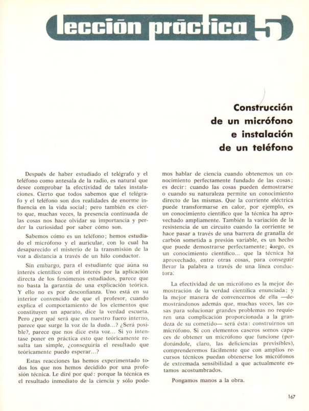 Como ejemplo, tenéis aquí el caso de una guía para la «Construcción de un micrófono e instalación de un teléfono» que nos envía nuestro colega Emilio Borque, procedente de una lección práctica de un curso de Ediciones AFHA de los años 70 del siglo pasado.