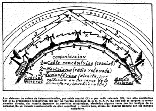 Sistemas de enlace de telecomunicación. Figura explicativa inserta en el articulo de Emilio Novoa en el ABC de 16 de febrero de 1958.