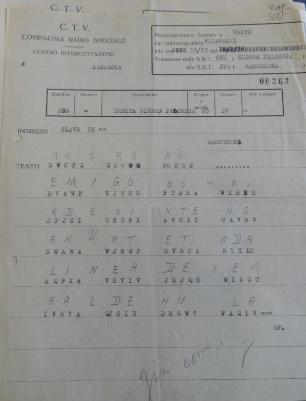Respecto a muchos documentos que contienen información similar (como por ejemplo, radiogramas captados, listados de claves de encriptación, equipos, personal, etc) solo se ha reproducido una muestra significativa, no el total de los documentos, que creemos más que suficiente para un estudio cualitativo. Para posibles estudios cuantitativos, los investigadores deberán acudir al archivo físico y consultar todos los expedientes.