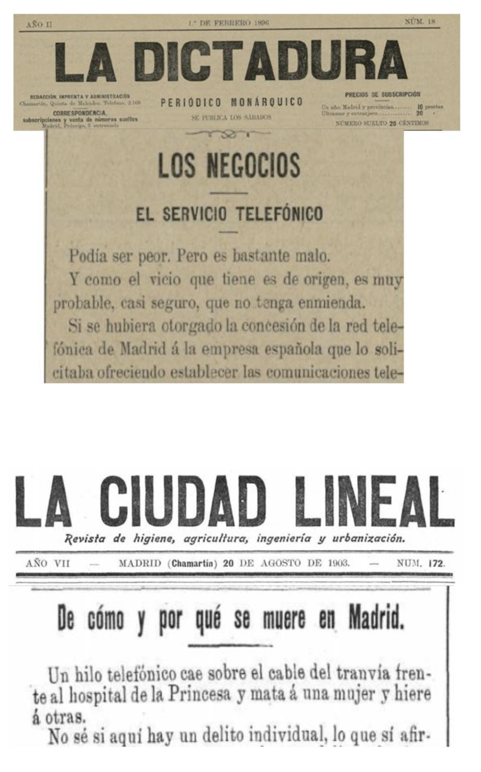 “Ayer fue remitido por el Ministerio de la Gobernación al Consejo de Estado, el expediente de concurso relativo a la concesión de la red telefónica. Dicho expediente, que ya estuvo en aquel alto cuerpo y que fue devuelto al Ministerio para que la Dirección de Telégrafos emitiera su dictamen, contiene cuatro proposiciones; una suscrita por una casa inglesa, dos por las sociedades de electricidad establecidas en Barcelona y la última suscrita por un conocido industrial de Madrid que se halla al frente de una compañía de tranvías. La Dirección de Telégrafos al consignar su opinión, parece que informa poco favorablemente respecto de uno de los expresados solicitantes, fundándose en que ofrece demasiado y no es conocido entre los hombres de ciencia que se dedican a aquella clase de construcciones. La razón no deja de ser chusca.”