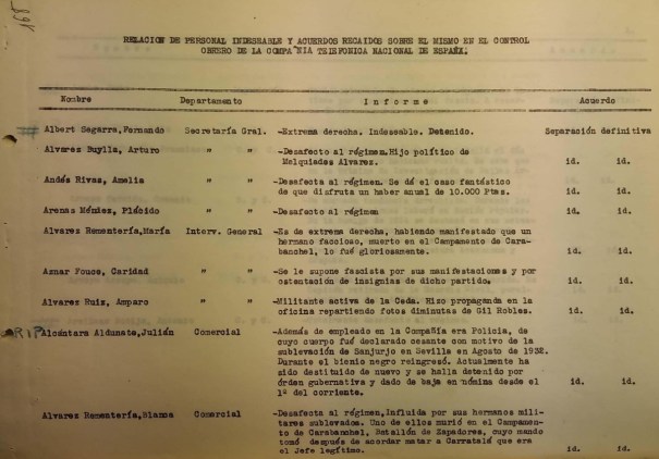 – La relación de empleados destituidos por el Comité de Control Obrero, muchos de ellos luego detenidos y algunos asesinados. En la imagen siguiente aparece una parte del listado manejado, en el que a lápiz aparece en algunos casos una indicación de RIP, que coincide, en los casos que hemos podido comprobar documentalmente -un tercio aproximadamente-, con personas asesinadas más tarde por las milicias republicanas, como fue el caso de dos hijos de Urquijo que eran a su vez directivos de la CTNE;