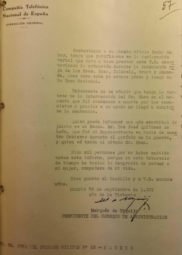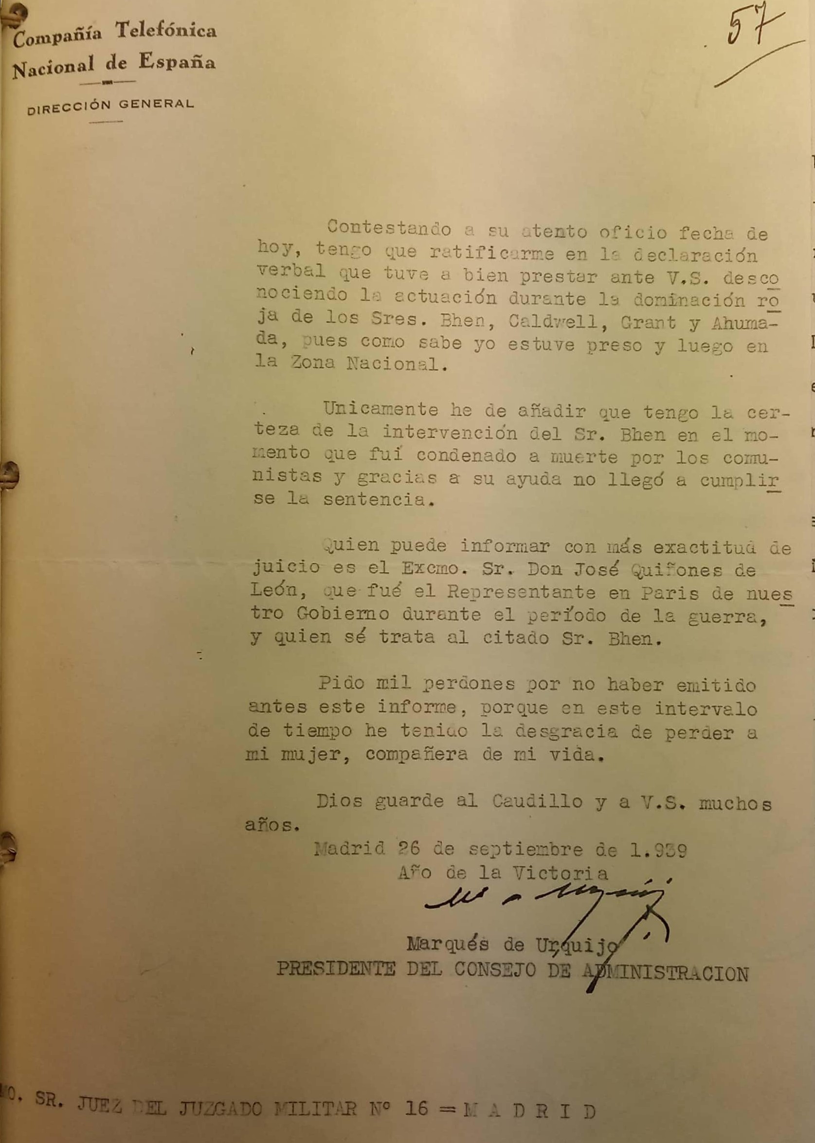 – Abundantes declaraciones de directivos de la CTNE tanto en zona republicana como nacional. Lógicamente, son especialmente relevantes son las Sosthenes Behn y Fred Caldwell, además de las del propio Marqués de Urquijo, quien declaró que Behn fue vital para salvarle la vida.