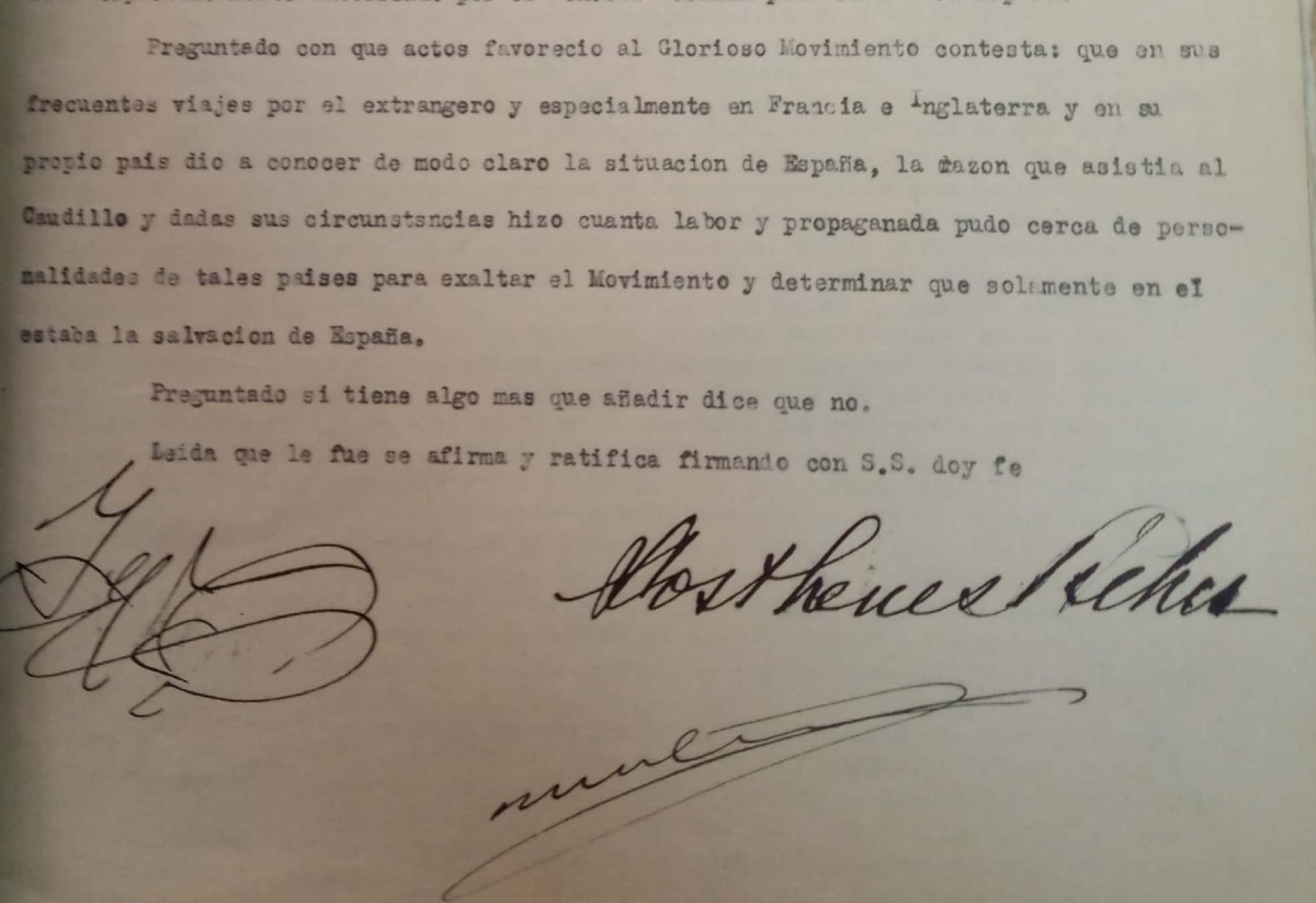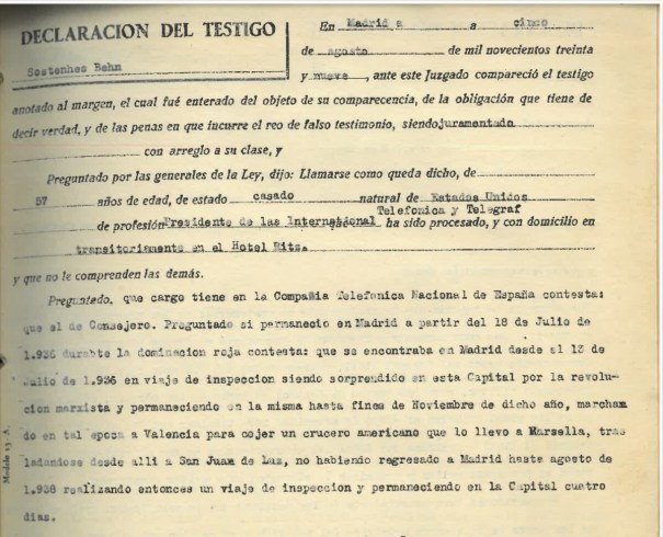 – Declaraciones de otros empleados de la CTNE y de personas que tuvieron relación con los directivos en zona republicana. Es muy curiosa la de una persona que atendió a Sosthenes Behn y de la que se publicaron declaraciones suyas en el ABC, la edición de Sevilla, es decir de zona nacional. De hecho el propio diario de esa fecha forma parte del legajo del AGHD.