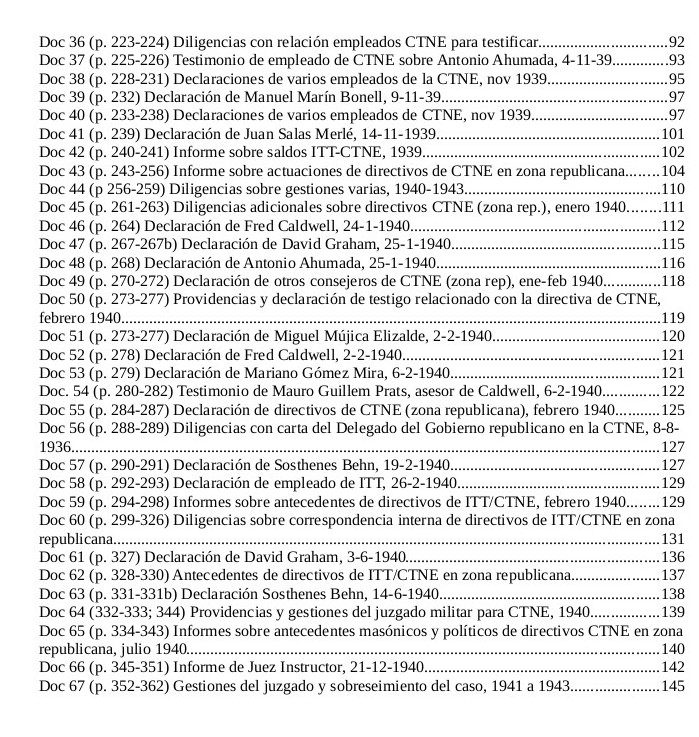 – Informes internos de la CTNE, de Falange y de los responsables judiciales sobre la actuación de la directiva en zona republicana, que reflejan la parcialidad de la instrucción en aras a conseguir un resultado desfavorable para la ITT.