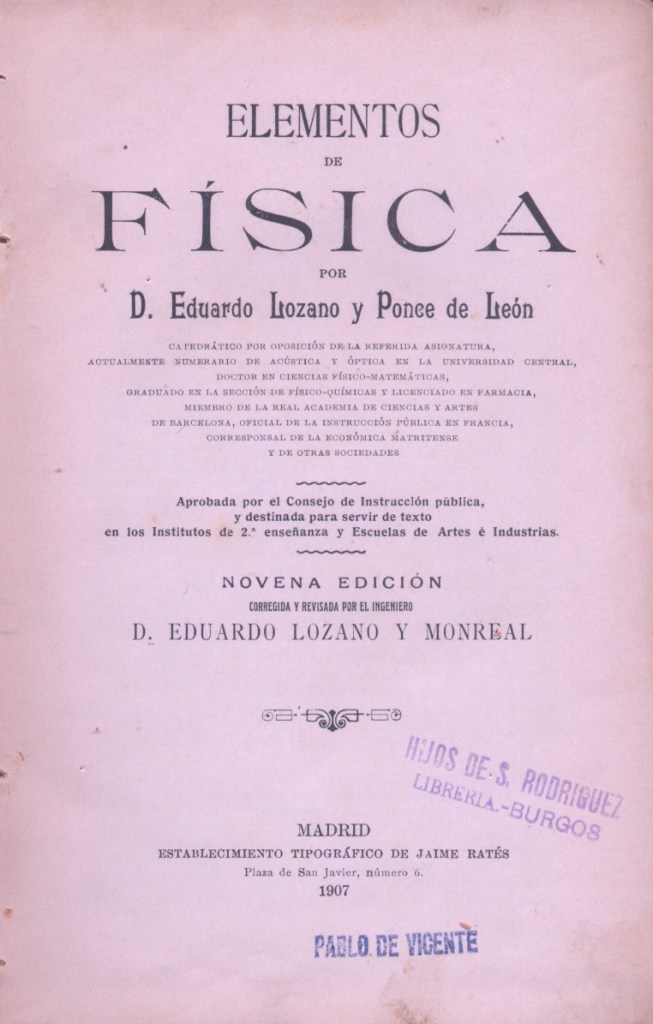 Los libros técnicos antiguos que reflejan la situación en su momento de la tecnología en desarrollo con sus cambios y avances, pueden ser muy útiles para comprender la propia historia de cada disciplina, por ejemplo al comprobar usos terminológicos que posteriormente se asentaron o desaparecieron, neologismos adoptados de otras lenguas, errores conceptuales, o desarrollos que con el tiempo se abandonarían en unos casos y en otros se consolidarían. Eso buscamos en los que analizamos en nuestra serie «Las telecomunicaciones en los libros» que continuamos, en esta ocasión, con uno de los pocos textos de Física escrito por un catedrático español a finales del siglo XIX, «Elementos de Física» por el extremeño D. Eduardo Lozano y Ponce de León (1844-1927), Doctor y Catedratico en Física en la Universidad de Barcelona y en la Universidad Central de Madrid entre otros puestos.