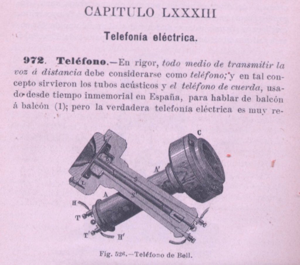 Se describe el aparato de Bell formado por el «teléfono transmisor» y el «teléfono receptor» pasando rápidamente a describir el micrófono, «un instrumento que sirve para amplificar sonidos débiles» y como consecuencia de la aplicación de éstos al invento de Bell, aparece el microteléfono y como ejemplo destacado el microteléfono de Ader, del que se describe y explica su funcionamiento.