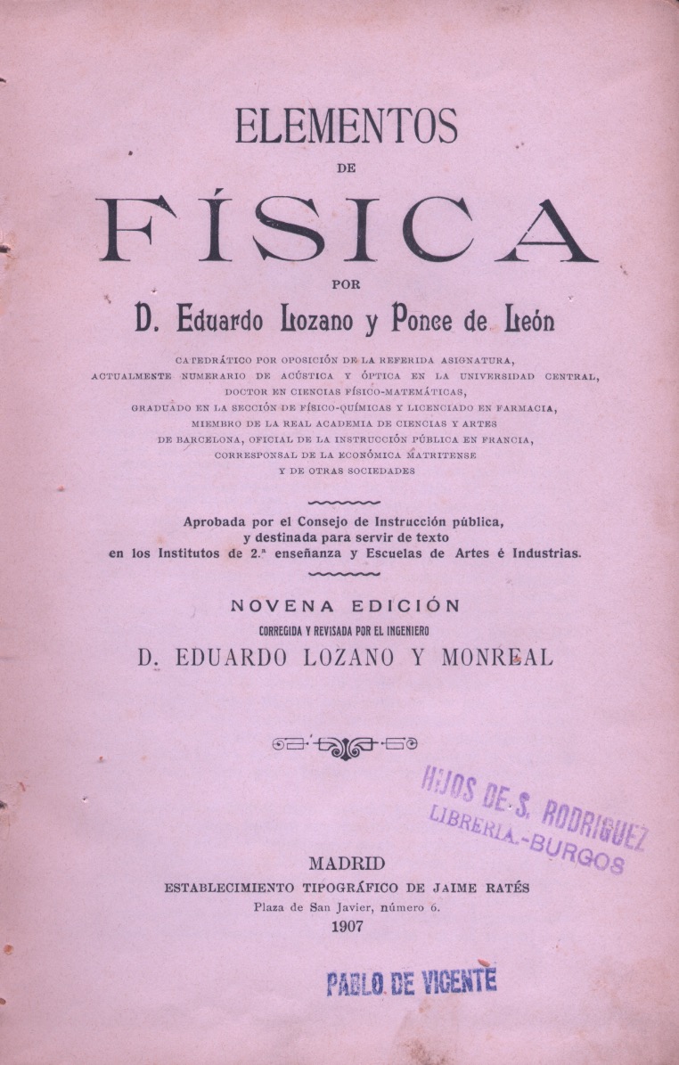 Los libros técnicos antiguos que reflejan la situación en su momento de la tecnología en desarrollo con sus cambios y avances, pueden ser muy útiles para comprender la propia historia de cada disciplina, por ejemplo al comprobar usos terminológicos que posteriormente se asentaron o desaparecieron, neologismos adoptados de otras lenguas, errores conceptuales, o desarrollos que con el tiempo se abandonarían en unos casos y en otros se consolidarían. Eso buscamos en los que analizamos en nuestra serie «Las telecomunicaciones en los libros» que continuamos, en esta ocasión, con uno de los pocos textos de Física escrito por un catedrático español a finales del siglo XIX, «Elementos de Física» por el extremeño D. Eduardo Lozano y Ponce de León (1844-1927), Doctor y Catedratico en Física en la Universidad de Barcelona y en la Universidad Central de Madrid entre otros puestos.