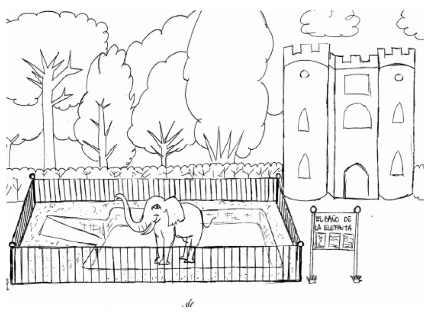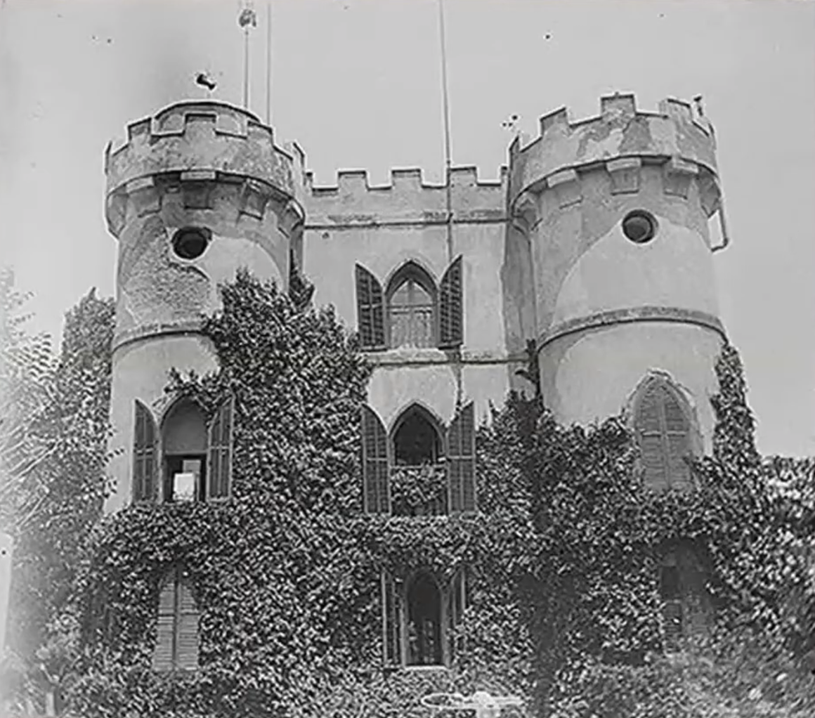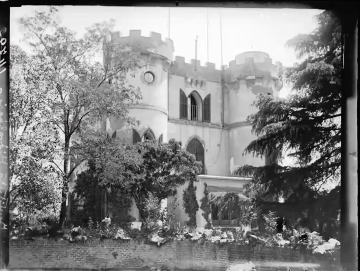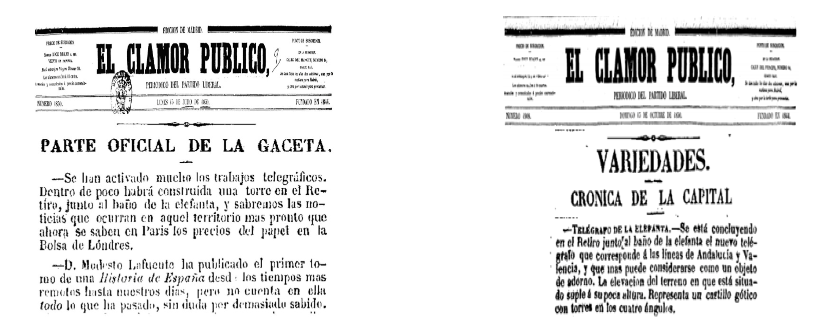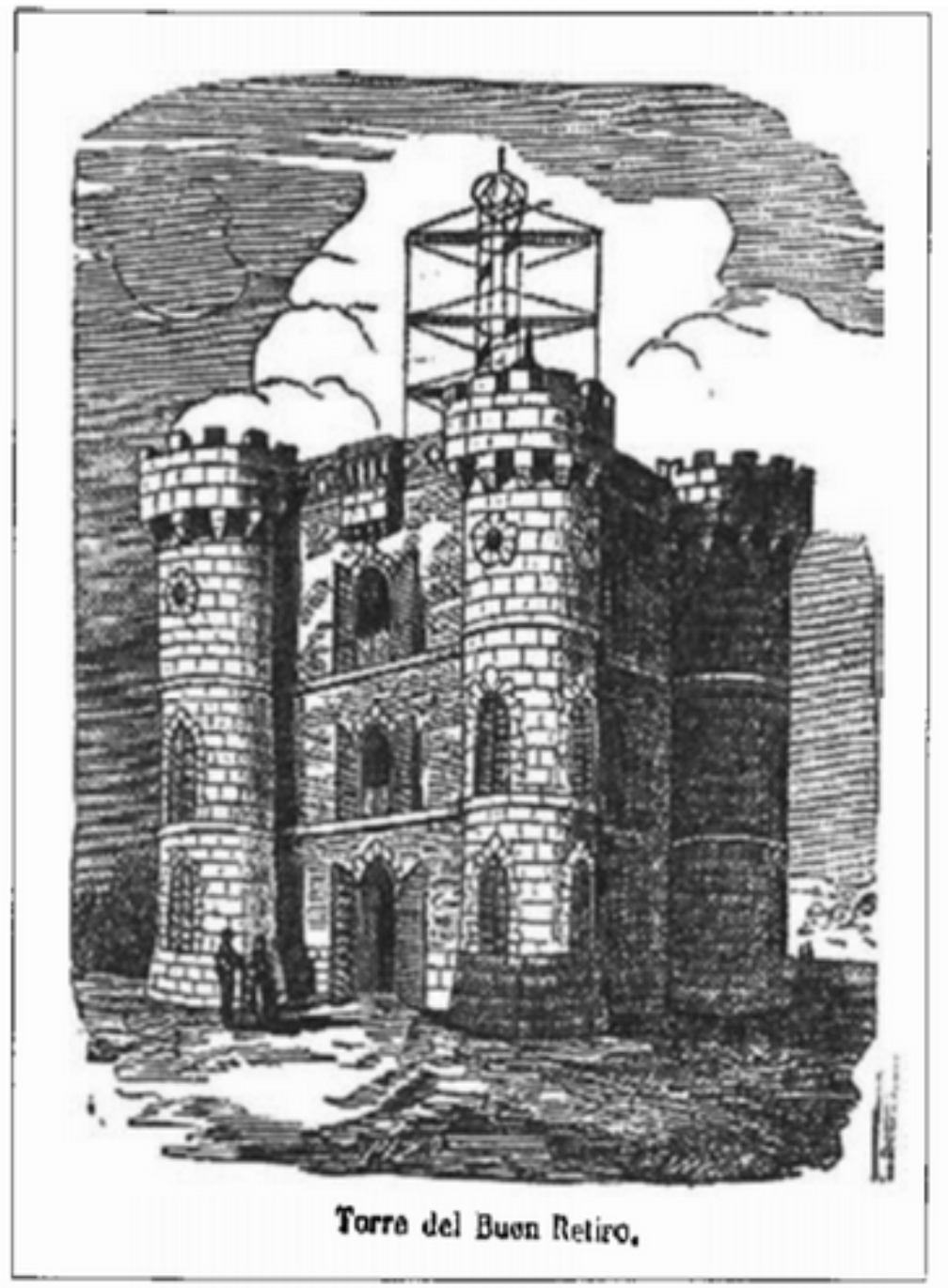 «TELÉGRAFO DE LA ELEFANTA.- Se está concluyendo en el Retiro junto al baño de la elefanta el nuevo telégrafo que corresponde a las líneas de Andalucía y Valencia, y que más puede considerarse como un objeto de adorno. La elevación del terreno en que está situado suple a su poca altura. Representa un castillo gótico con torres en los cuatro ángulos»