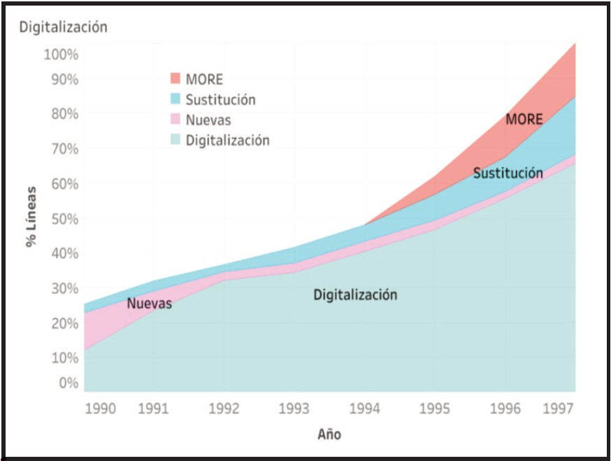 Este cambio radical de comportamiento ponía en peligro el éxito de la modernización de las centrales analógicas, teniendo que recurrir a soluciones de emergencia como el reciclaje de equipos listos para el desguace, trasladándolos e instalándolos en las centrales MORE. En definitiva, había que ampliar enlaces, ¡que eran analógicos! y por tanto instalar los elementos necesarios para ello.