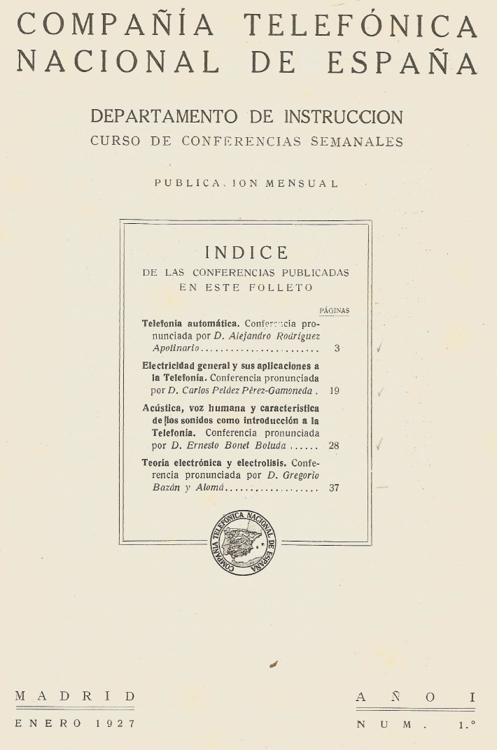 «…el sábado, 18 de septiembre, se dio la primera conferencia de la serie organizada por el Departamento de Instrucción, en la que disertó sobre “Telefonía automática” el competente ingeniero D. Alejandro Rodríguez Apolinario, quien expuso, en palabras para todos, los fundamentos del sistema automático.