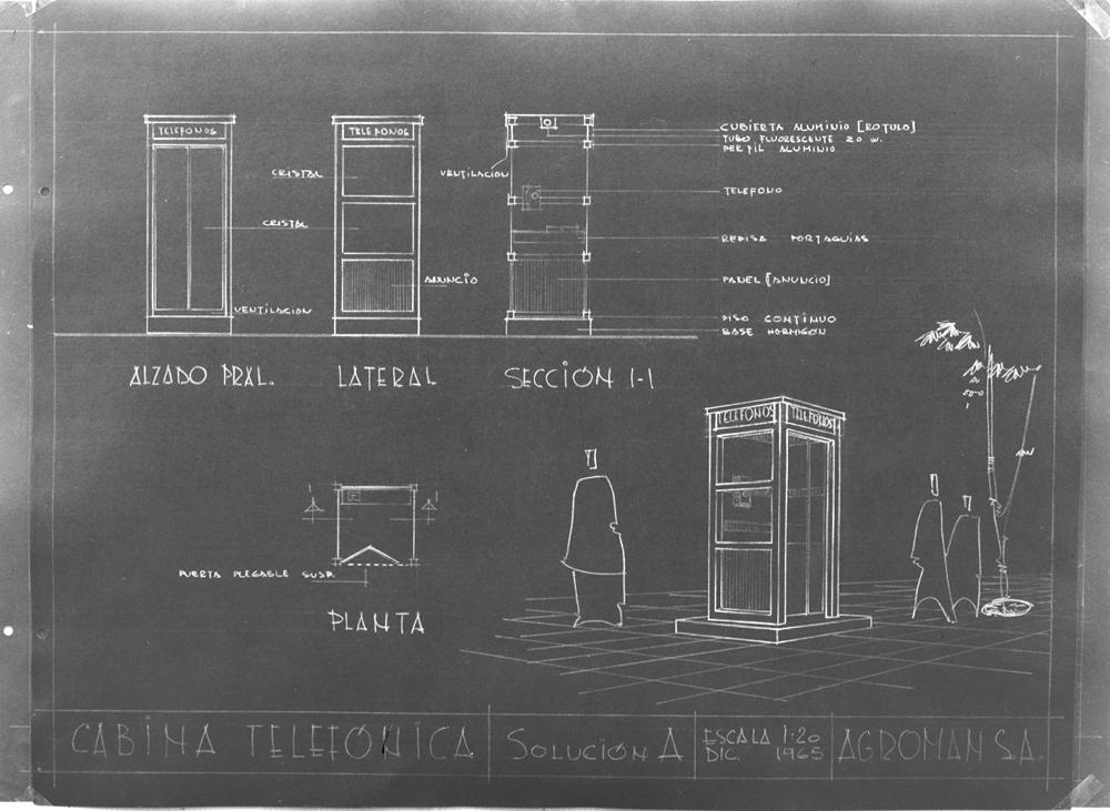 (*) Como curiosidad en el archivo del IPCE se pueden encontrar en el Archivo Pando, seis interesantes negativos fechados en 1965 (signaturas PAN-B-001531 a PAN-B-001536) de planos de diseño de varios modelos de cabinas telefónicas encargados en su día por la Agencia de Publicidad Stentor para la constructora Agromán.