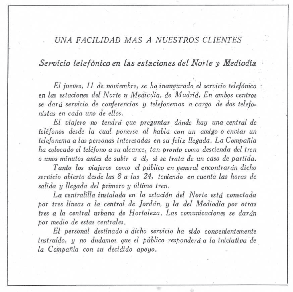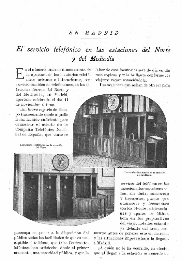 Desde los primeros momentos del desarrollo de la telefonía se dispuso de locutorios públicos siempre atendidos por operadoras, con sus «cabinas (locutorios) telefónicas» para facilitar la intimidad de las comunicaciones, desde donde se podían establecer las conferencias urbanas o interurbanas. Uno de los primeros ejemplos de la CTNE en 1926 fueron los locutorios establecidos en las estaciones de ferrocarril, como el caso de las estaciones madrileñas de Norte y del Mediodía en 1926 que se anunciaba en la Revista Telefónica.