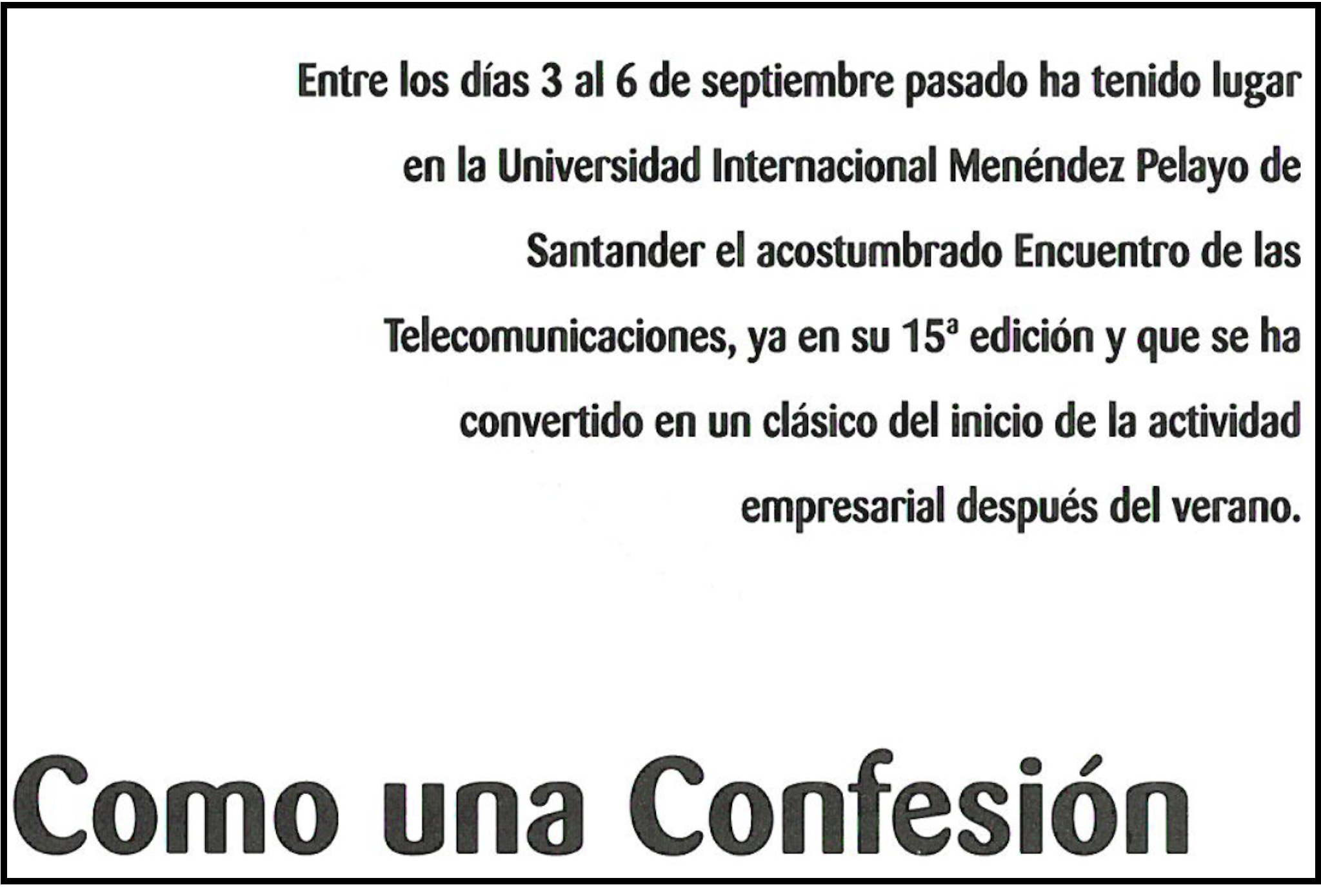 El articulo lo tituló «Como una Confesión», y justo ahora transcurridas dos décadas y en medio de una pandemia general, cuando se está evidenciando la importancia de las actuales redes de comunicación, que son el núcleo imprescindible de esa «sociedad de la información», es interesante releer lo que entonces se comentaba y reflexionar sobre ello. Lo podemos leer completo en el archivo de la propia revista en la web del COIT en este enlace, o directamente aquí.
