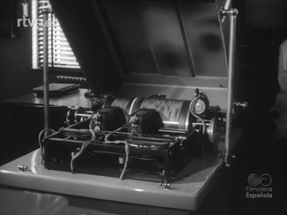 Fotograma del documental «Al Habla la Telefónica» (7:25). Máquina automática de locución de la hora (servicio de información horaria) (Fuente: Archivo RTVE y Filmoteca Española)