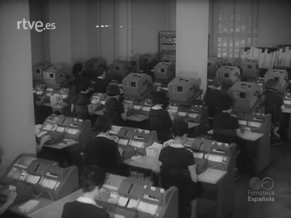 Fotograma del documental «Al Habla la Telefónica» (8:43). Proceso técnico de generación de las facturas (Fuente: Archivo RTVE y Filmoteca Española)