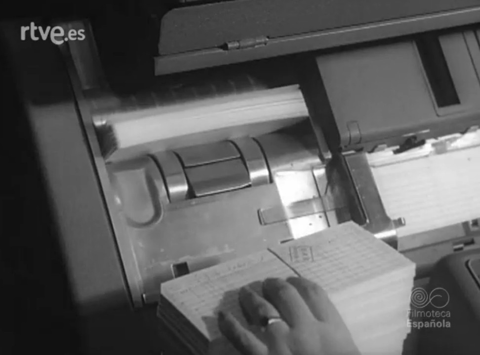 Fotograma del documental «Al Habla la Telefónica» (9:20). Proceso técnico de generación de las facturas Impresora UNIVAC (Fuente: Archivo RTVE y Filmoteca Española)