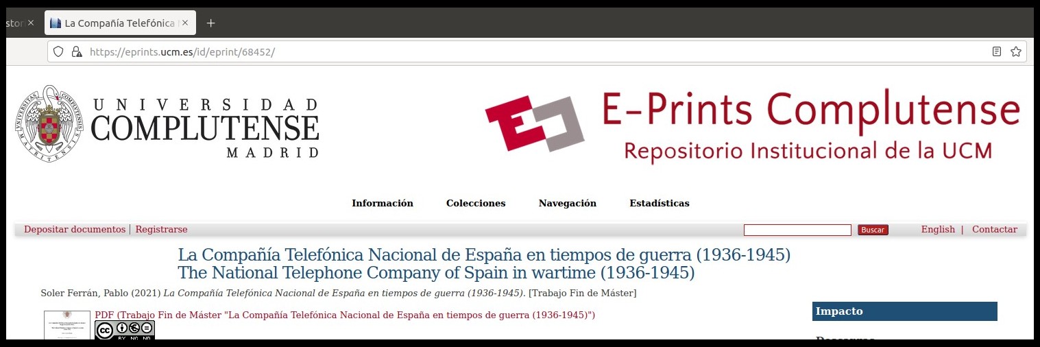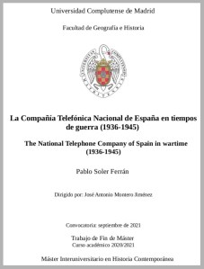 Ya está disponible en el Repositorio Institucional de la UCM (los E-Prints Complutense) el Trabajo Fin de Máster (TFM) “La Compañía Telefónica Nacional de España en tiempos de guerra (1936-1945)”.