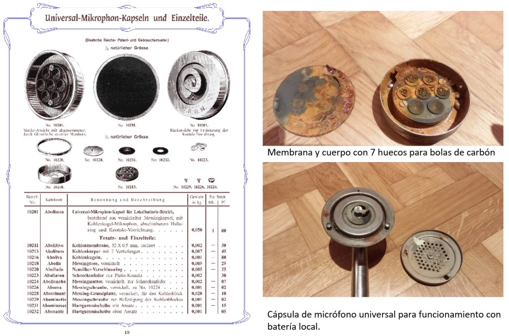 El interior del transmisor alberga una cápsula microfónica, bastante deteriorada, del tipo universal patentada por la casa alemana C. Lorenz para el Deutsche Reichspost en 1903 y que se instaló en muchos aparatos de otras marcas [1]. A diferencia de las originales, nuestra cápsula no tiene ninguna marca que la identifique.