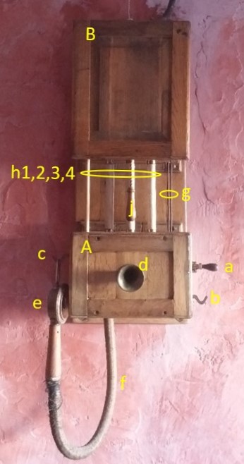 El usuario ha modificado el interior introduciendo un teléfono moderno. El magneto faltante estaba en la parte superior de la caja de arriba y se le transmitía el movimiento desde la manivela mediante una correa de cuero [g] que también sustituyó el usuario al estar la original rota, añadiendo una polea en el otro extremo para simular el funcionamiento del magneto. Una perilla [j] que cuelga de la caja superior completa el montaje; sospechamos que la función de dicha perilla era dar paso a la parte del circuito que hacía posible la llamada a través del magneto.