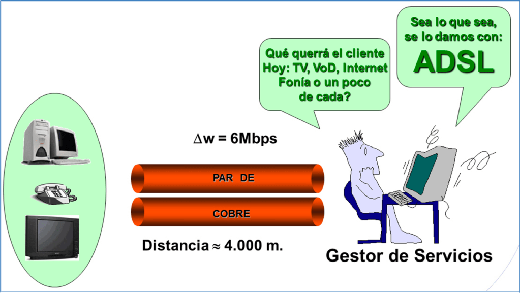 Hasta entonces, los 4 KHz del par de cobre, para la transmisión de señales analógicas como la fonía y datos, era el contenido único. Desde la aparición de tecnologías; con desarrollos de algoritmos que han sido capaces de inmunizar, frente a las interferencias, el par de cobre como medio de transmisión convencional, como las basadas en xDSL; han permitido conseguir anchos de banda de 1,1 MHz y velocidades de transmisión superiores a 6 Mbps en distancias de cobre cercanas a 4 Km (bucles rectos). El reto digital, respetando la calidad del servicio, era muy notable, basta con comparar la relación de BW de la fonía y la TV (270Mbps ó 160Mbps frente a los 64 Kbps).