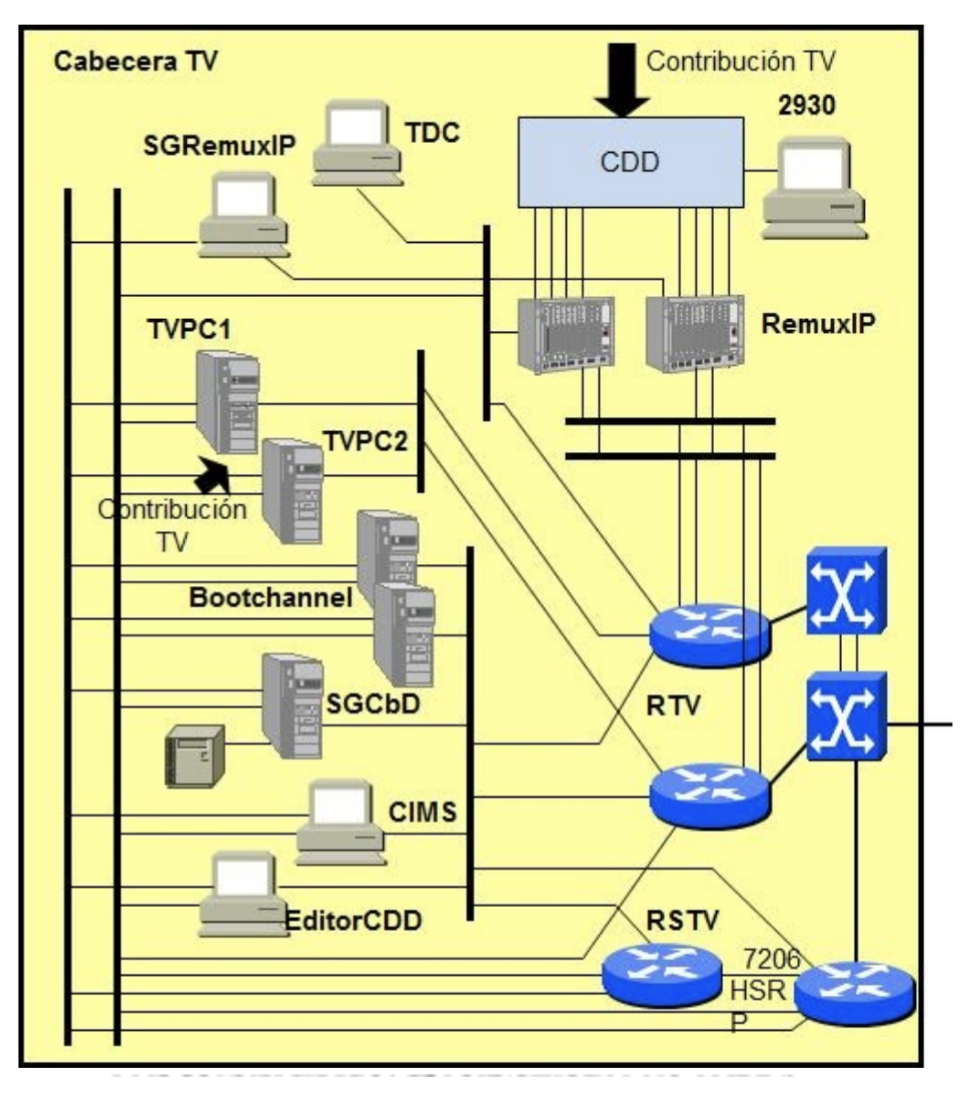 A finales de esos años, Telefónica inició su andadura en la incorporación de nuevos servicios de valor añadido e interactivos. Una diferencia, con los servicios que ya prestaba, fue la de diseñar las infraestructuras para la creación de una nueva red que mediante la incorporación de un canal de retorno permitiera a sus clientes/usuarios demandar nuevos servicios e interactuar con ellos, así como una cabecera de tv (Ilustración 1) con la incorporación de servidores de vídeo para el bombeo de contenidos hacia sus clientes, llegó el Video Bajo Demanda (VbD): Ha sido el hito, desde mi punto de vista, más importante para una operadora de telecomunicaciones. Telefónica ya disponía de la telefonía y de los datos, sólo faltaba la imagen, para lo cual se desarrollaron proyectos como: IMAGENIO vs XDSL. Un binomio que permitía vincular estrechamente la tecnología del XDSL y los servicios añadidos (con mucha mayor exigencia en cuanto a BW) a través de proyectos y tecnologías como GigaDSL, ADSL9, VDSL10, SDSL11, BWLL12, MMDS13, DTH14, SHDSL15, HFC16 e Imagenio (en su fase pre-comercial de despliegue, se denominó Alejandra).