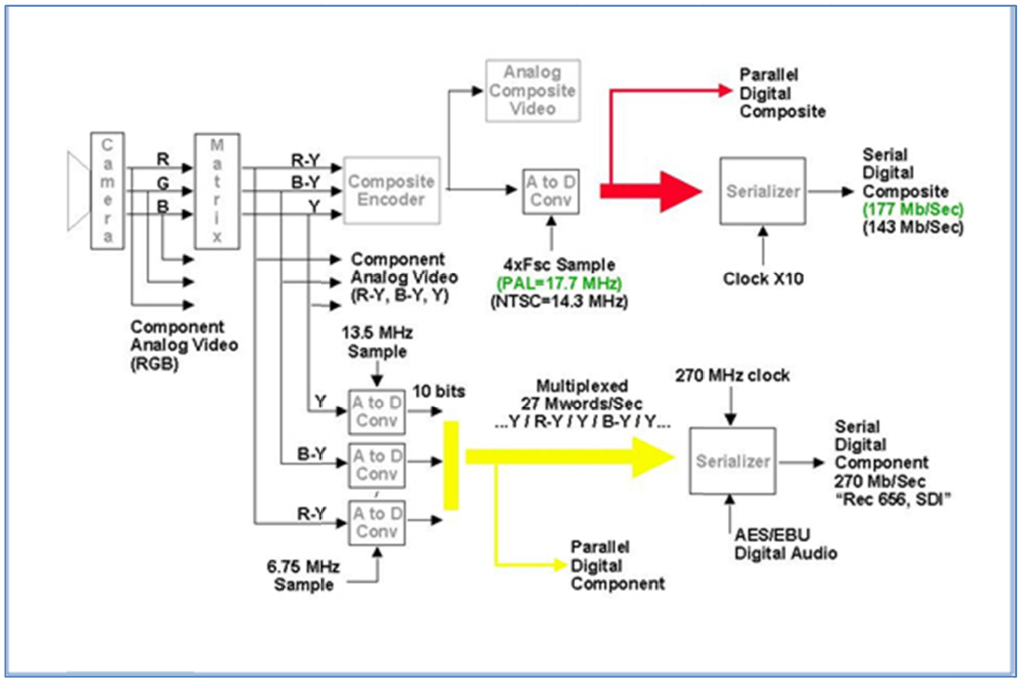 Otro de los formatos empleados en la producción de señales de TV es la señal digital en componentes, este formato proporciona una imagen de mayor calidad mediante el tratamiento, por separado, de la señal de luminancia y cada una de las dos señales diferencia de color. Las salidas de los tres ADC´s se distribuyen por un bus de transmisión local, a una velocidad de 27 Mpalabras por segundo, hasta el serializador que convierte la interfaz paralela a la interfaz serie (Rec. 656) de 270 Mbps SDI.
