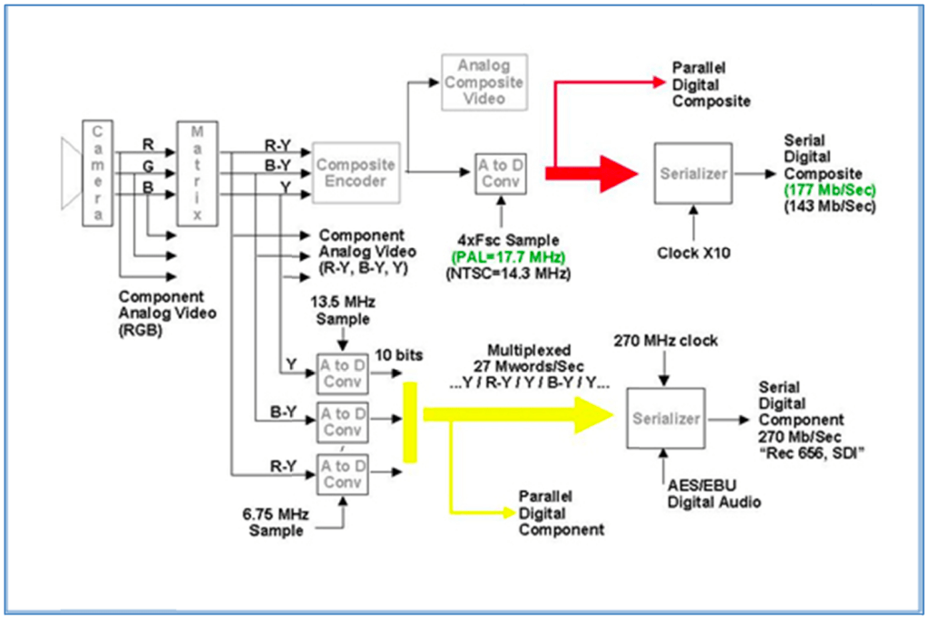Los Estándares de Definición en Televisión (SDTV28) se emplean en los estudios para la producción de programas tanto en formato de vídeo compuesto como de vídeo en componentes. La señal digital compuesta se obtiene como resultado de un proceso de tres fases: la primera fase consiste en, a partir de la señal de vídeo en componentes, reconstruir la señal de vídeo compuesta mediante la modulación en cuadratura de las dos señales de crominancia (Ur , Ub) por la subportadora de color (4,43 Mhz para la señal PAL) y su posterior incorporación a la señal de luminancia; una vez obtenida la señal analógica compuesta de vídeo, se digitaliza mediante el correspondiente ADC29 (Ilustación 5), el cual presenta una frecuencia de muestreo de cuatro veces la frecuencia de la subportadora de color. La tercera fase, la compone un registro de desplazamiento paralelo serie convirtiendo la señal digital paralelo a una interfaz digital serie.