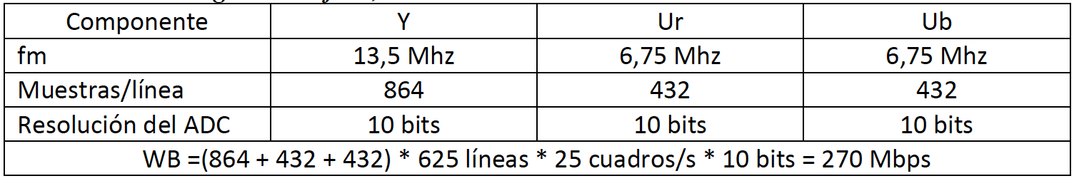 BW = (864 + 432 + 432) * 625 líneas * 25 cuadros/s * 10 bits = 270 Mbps