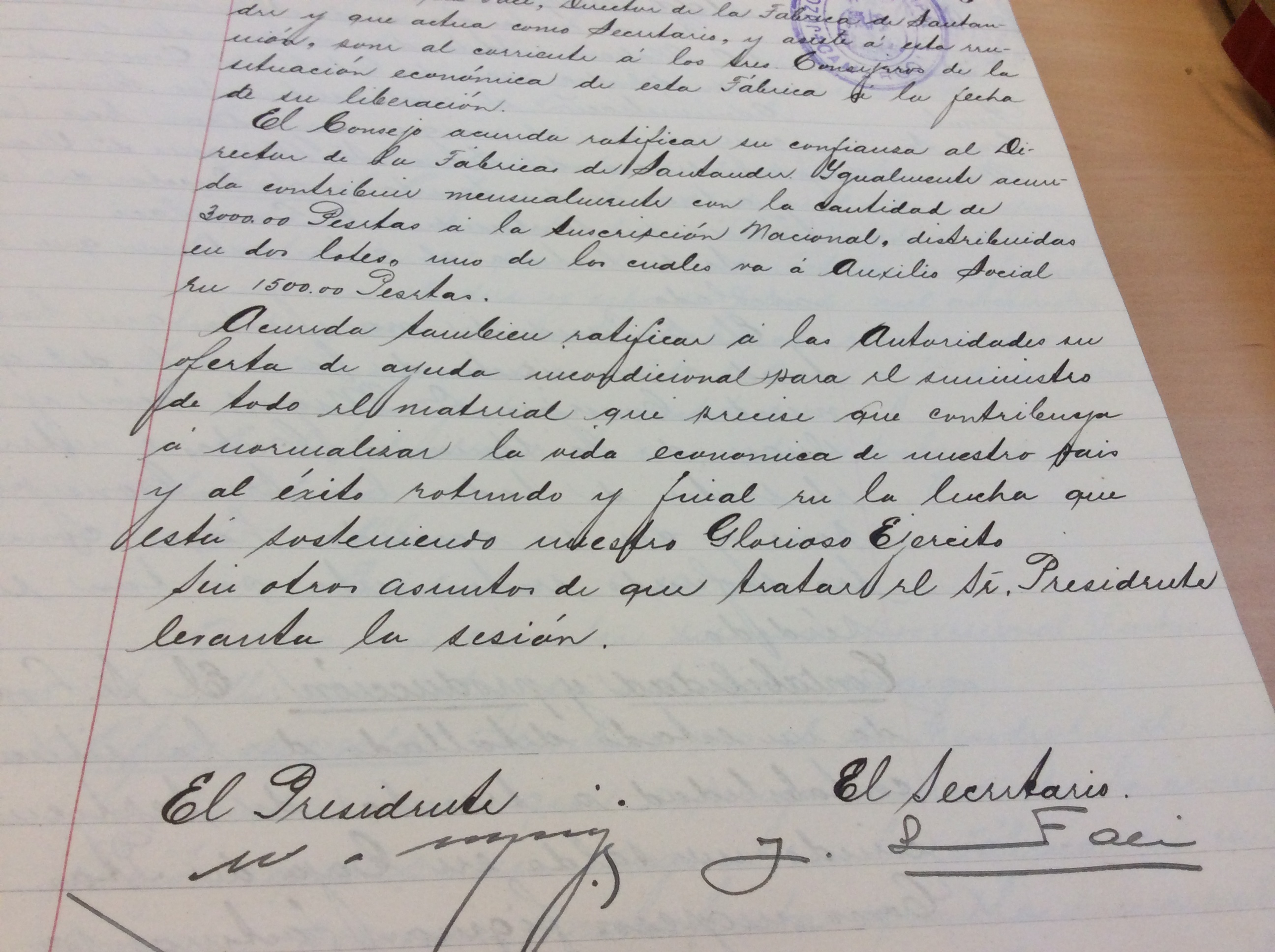 Siendo esta su primera reunión empiezan expresando su gratitud a nuestro Glorioso Ejército Liberador que en su avance triunfador y rapidísimo, ha podido liberar muestra fábrica de Cables de Maliaño de la destrucción de las hordas rojas. Extendiendo su respetuosa admiración a su Caudillo, el Generalísimo Franco que con su inteligencia y valor estratégico condujo de una manera admirable las operaciones tan felices que permitieron incorporar en pocos días la provincia entera de Santander a la Nueva España.