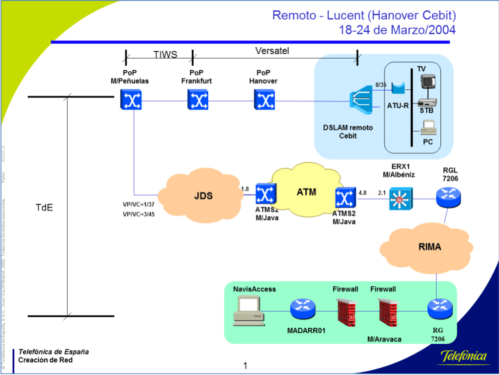 • Pruebas del servicio en Cebit: Tráfico de Cliente. Las pruebas finales en el stand del Cebit se llevaron a cabo el 16/3/2004 y consistieron en probar el tráfico de gestión (128Kbps) y el de Cliente (6.015Kbps).